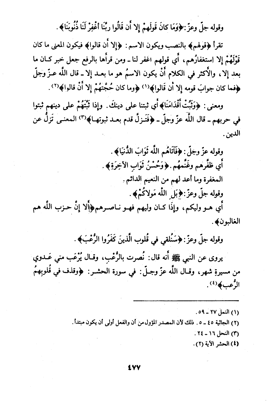 وقوله جلَّ وعزَّ: (وَمَا كَانَ قَوْلَهُمْ إِلَّا أَنْ قَالُوا رَبَّنَا اغْفِرْ لَنَا ذُنُوبَنَا وَإِسْرَافَنَا فِي أَمْرِنَا وَثَبِّتْ أَقْدَامَنَا وَانْصُرْنَا عَلَى الْقَوْمِ الْكَافِرِينَ (147)