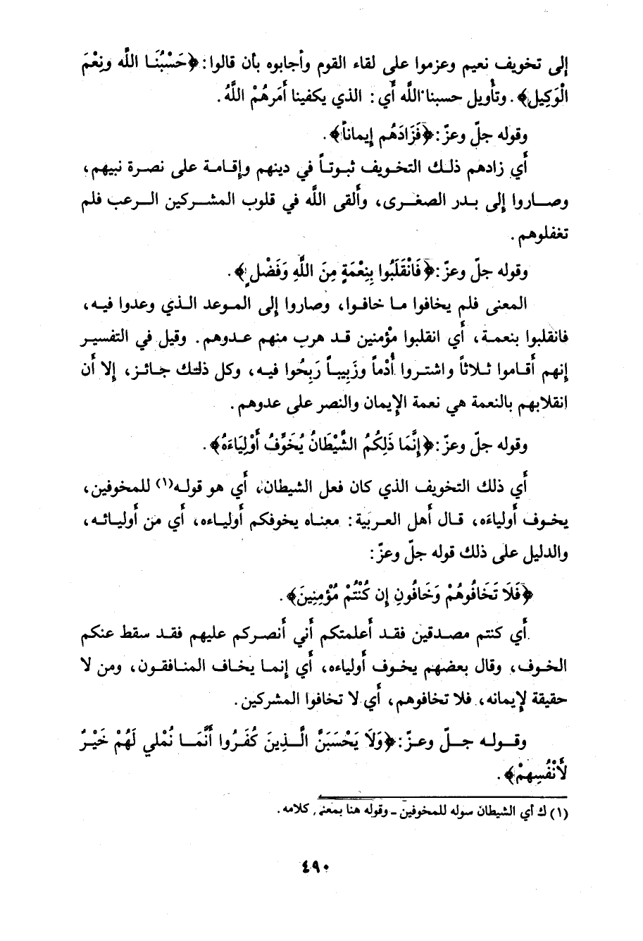 وقوله جلَّ وعزَّ: (إِنَّمَا ذَلِكُمُ الشَّيْطَانُ يُخَوِّفُ أَوْلِيَاءَهُ فَلَا تَخَافُوهُمْ وَخَافُونِ إِنْ كُنْتُمْ مُؤْمِنِينَ (175)