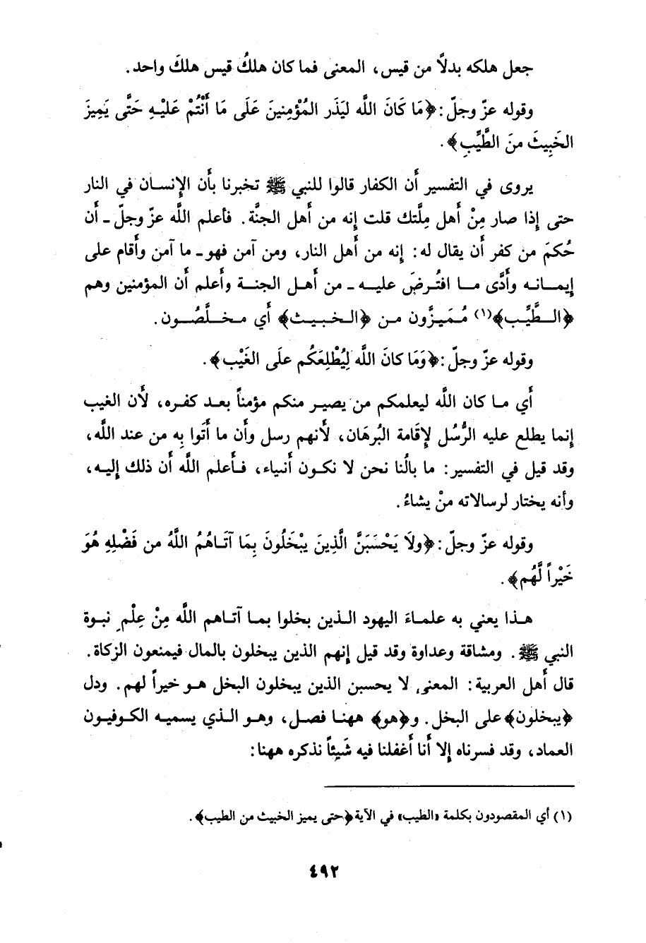 وقوله عزَّ وجلَّ: (مَا كَانَ اللَّهُ لِيَذَرَ الْمُؤْمِنِينَ عَلَى مَا أَنْتُمْ عَلَيْهِ حَتَّى يَمِيزَ الْخَبِيثَ مِنَ الطَّيِّبِ وَمَا كَانَ اللَّهُ لِيُطْلِعَكُمْ عَلَى الْغَيْبِ وَلَكِنَّ اللَّهَ يَجْتَبِي مِنْ رُسُلِهِ مَنْ يَشَاءُ فَآمِنُوا بِاللَّهِ وَرُسُلِهِ وَإِنْ تُؤْمِنُوا وَتَتَّقُوا فَلَكُمْ أَجْرٌ عَظِيمٌ (179)