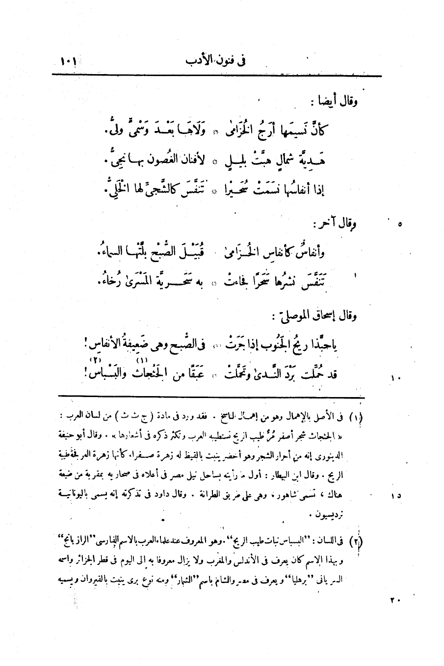 [2] فى اللسان: «البسباس نبات طيب الريح» . وهو المعروف عند علماء العرب بالاسم الفارسى «الرازيانج» وبهذا الاسم كان يعرف فى الأندلس والمغرب ولا يزال معروفا به إلى اليوم فى قطر الجزائر واسمه السريانى «برهليا» ويعرف فى مصر والشام باسم «الشمار» ومنه نوع برى ينبت بالقيروان ويسميه