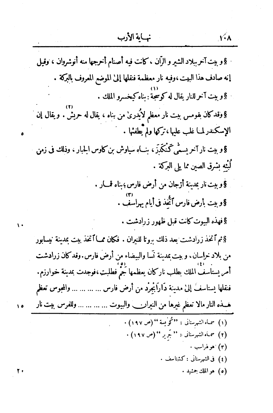ثم اتخذ زرادشت بعد ذلك بيوتا للنيران. فكان مما اتخذ بيت بمدينة نيسابور من بلاد خراسان، وبيت بمدينة نسا والبيضاء من أرض فارس. وقد كان زرادشت أمر يستاسف [4] الملك بطلب نار كان يعظمها جم [5] فطلبت، فوجدت بمدينة خوارزم.
