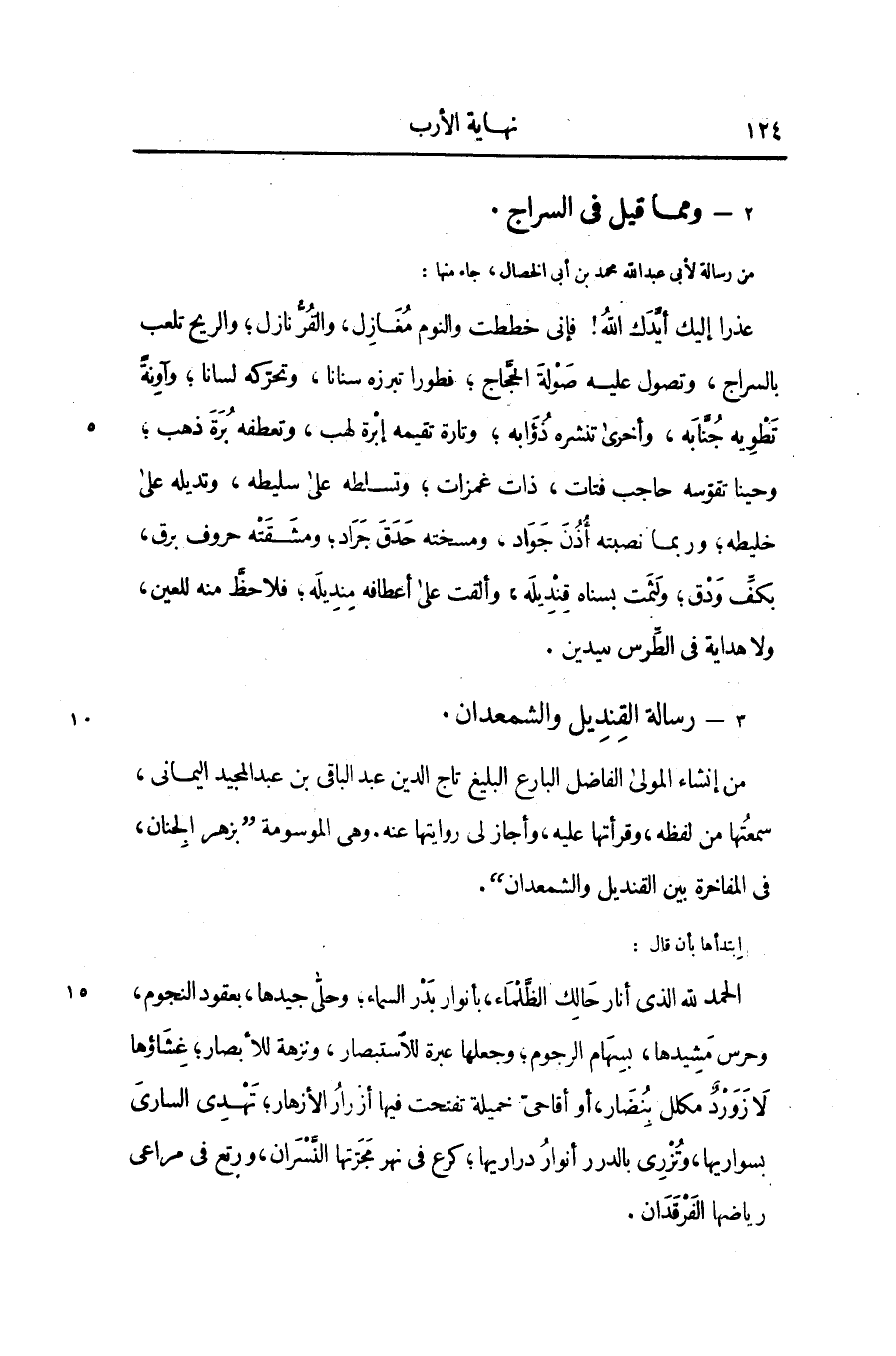 الحمد لله الذى أنار حالك الظّلماء، بأنوار بدر السماء؛ وحلّى جيدها، بعقود النجوم، وحرس مشيدها، بسهام الرجوم؛ وجعلها عبرة للاستبصار، ونزهة للأبصار؛ غشاؤها لا زورد مكلل بنضار، أو أقاحىّ خميلة تفتحت فيها أزرار الأزهار؛ تهدى السارى بسواريها، وتزرى بالدرر أنوار دراريها؛ كرع فى نهر مجرّتها النّسران، ورتع فى مراعى رياضها الفرقدان.