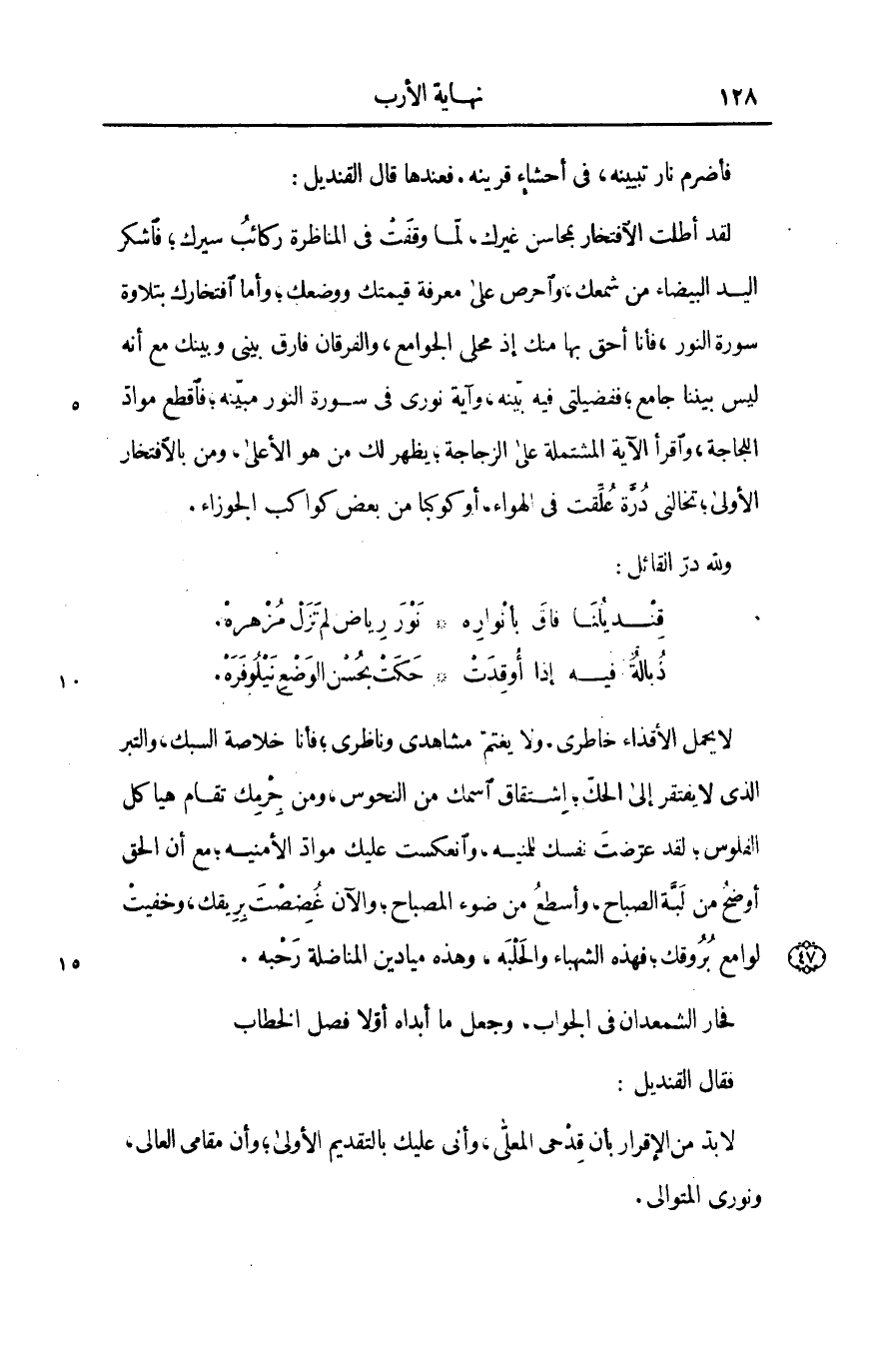 فأضرم نار تبيينه، فى أحشاء قرينه. فعندها قال القنديل: