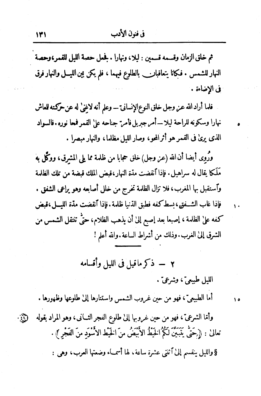 وأمّا الشرعىّ، فهو من حين غروبها إلى طلوع الفجر الثانى، وهو المراد بقوله تعالى: (حَتَّى يَتَبَيَّنَ لَكُمُ الْخَيْطُ الْأَبْيَضُ مِنَ الْخَيْطِ الْأَسْوَدِ مِنَ الْفَجْرِ) .