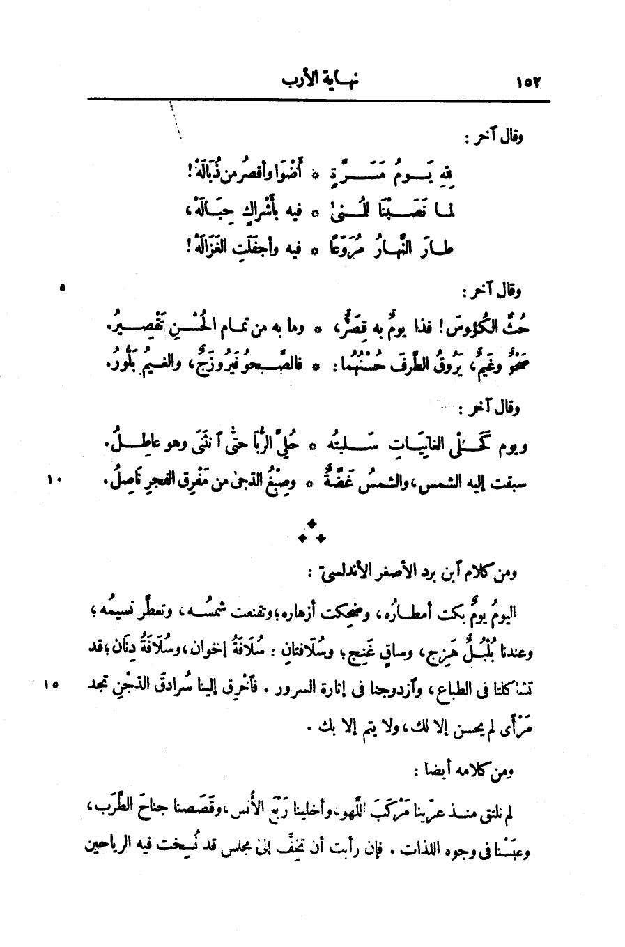 اليوم يوم بكت أمطاره، وضحكت أزهاره؛ وتقنعت شمسه، وتعطّر نسيمه؛ وعندنا بلبل هزج، وساق غنج؛ وسلافتان: سلافة إخوان، وسلافة دنان؛ قد تشاكلتا فى الطباع، وازدوجنا فى إثارة السرور. فاخرق إلينا سرادق الدّجن تجد مرأى لم يحسن إلا لك، ولا يتم إلا بك.