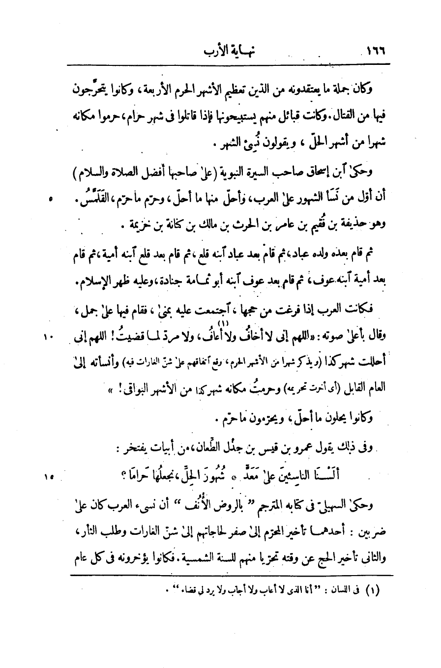 فكانت العرب إذا فرغت من حجها، اجتمعت عليه بمنى، فقام فيها على جمل، وقال بأعلى صوته: «اللهم إنى لا أخاف ولا [1] أعاف، ولا مردّ لما قضيت! اللهم إنى أحللت شهر كذا (ويذكر شهرا من الأشهر الحرم، وقع اتفاقهم على شنّ الغارات فيه) وأنسأته إلى العام القابل (أى أخرت تحريمه) وحرمت مكانه شهر كذا من الأشهر البواقى!» وكانوا يحلون ما أحلّ، ويحرّمون ما حرّم.