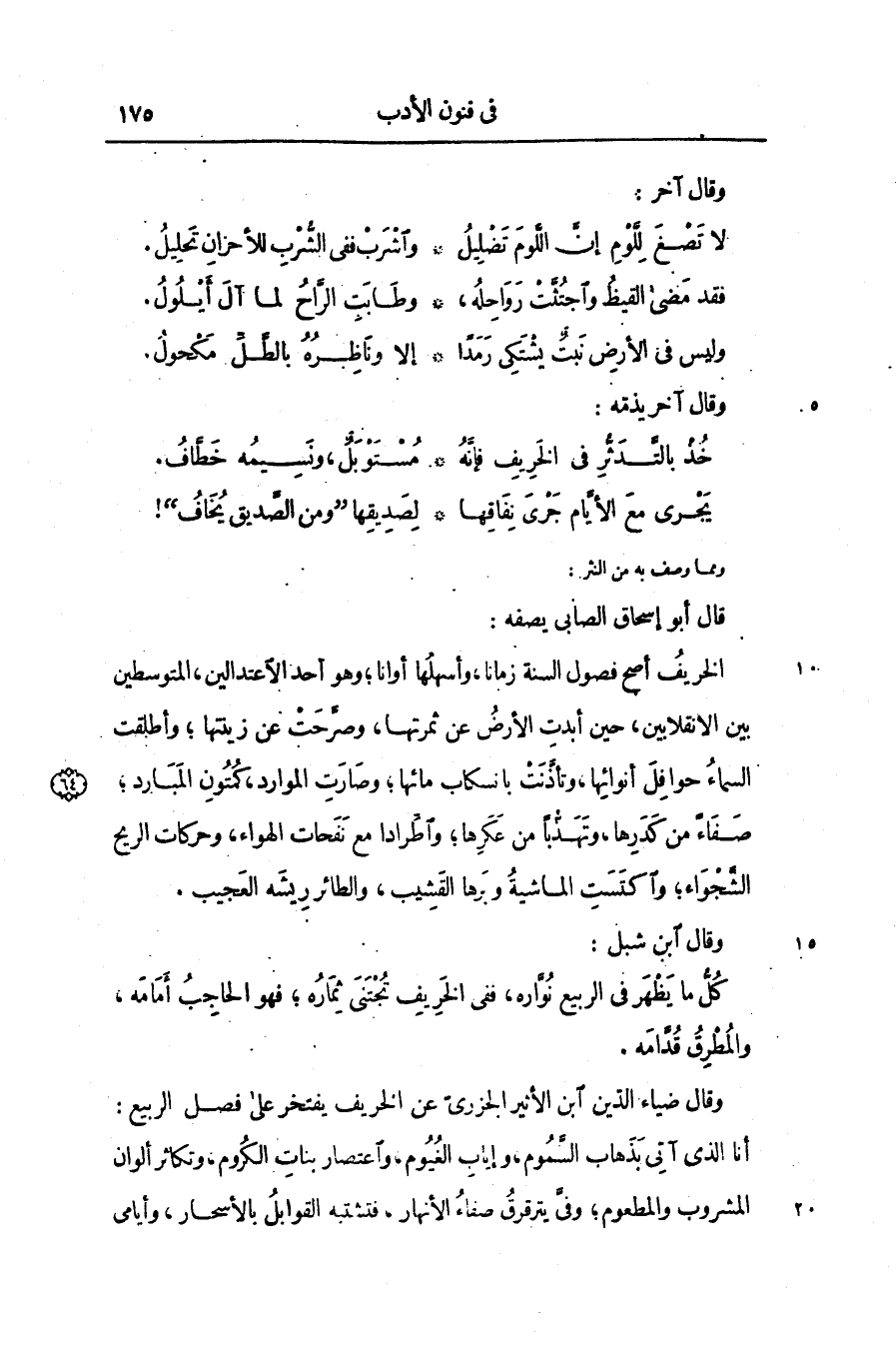 الخريف أصح فصول السنة زمانا، وأسهلها أوانا؛ وهو أحد الاعتدالين، المتوسطين بين الانقلابين، حين أبدت الأرض عن ثمرتها، وصرّحت عن زينتها؛ وأطلقت السماء حوافل أنوائها، وتأذّنت بانسكاب مائها؛ وصارت الموارد، كمتون المبارد؛ صفاء من كدرها، وتهذّبا من عكرها؛ واطّرادا مع نفحات الهواء، وحركات الريح الشّجواء؛ واكتست الماشية وبرها القشيب، والطائر ريشه العجيب.