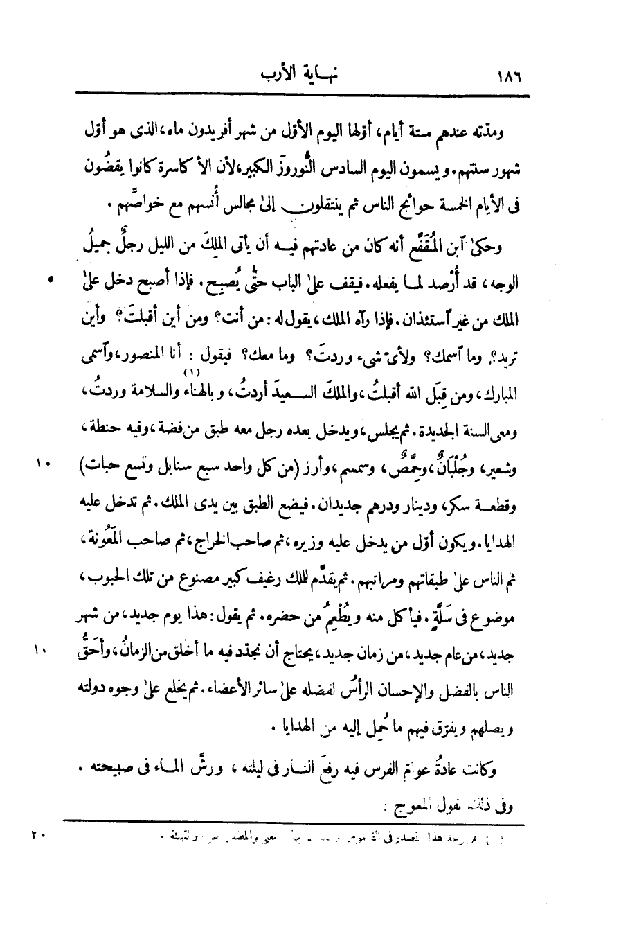 وحكى ابن المقفّع أنه كان من عادتهم فيه أن يأتى الملك من الليل رجل جميل الوجه، قد أرصد لما يفعله. فيقف على الباب حتّى يصبح. فإذا أصبح دخل على الملك من غير استئذان. فإذا رآه الملك، يقول له: من أنت؟ ومن أين أقبلت؟ وأين تريد؟ وما اسمك؟ ولأىّ شىء وردت؟ وما معك؟ فيقول: أنا المنصور، واسمى المبارك، ومن قبل الله أقبلت، والملك السعيد أردت، وبالهناء [1] والسلامة وردت، ومعى السنة الجديدة. ثم يجلس، ويدخل بعده رجل معه طبق من فضة، وفيه حنطة، وشعير، وجلبان، وحمّص، وسمسم، وأرز (من كل واحد سبع سنابل وتسع حبات) وقطعة سكر، ودينار ودرهم جديدان. فيضع الطبق بين يدى الملك. ثم تدخل عليه الهدايا. ويكون أوّل من يدخل عليه وزيره، ثم صاحب الخراج، ثم صاحب المعونة، ثم الناس على طبقاتهم ومراتبهم. ثم يقدّم للملك رغيف كبير مصنوع من تلك الحبوب، موضوع فى سلّة. فيأكل منه ويطعم من حضره. ثم يقول: هذا يوم جديد، من شهر جديد، من عام جديد، من زمان جديد، يحتاج أن نجدّد فيه ما أخلق من الزمان، وأحقّ الناس بالفضل والإحسان الرأس لفضله على سائر الأعضاء. ثم يخلع على وجوه دولته ويصلهم ويفرّق فيهم ما حمل إليه من الهدايا.