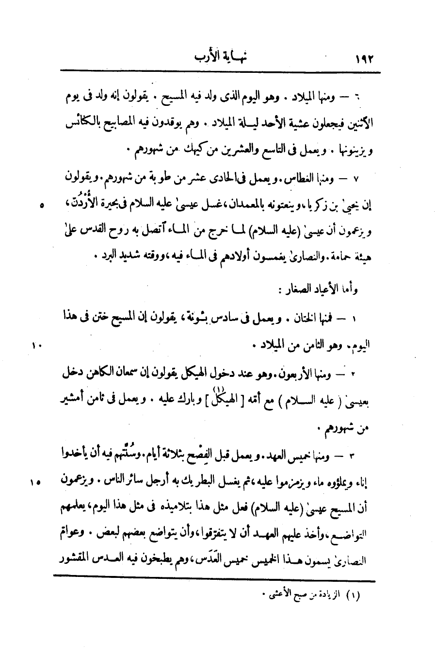 6- ومنها الميلاد. وهو اليوم الذى ولد فيه المسيح. يقولون إنه ولد فى يوم الاثنين فيجعلون عشية الأحد ليلة الميلاد. وهم يوقدون فيه المصابيح بالكنائس ويزينونها. ويعمل فى التاسع والعشرين من كيهك من شهورهم.