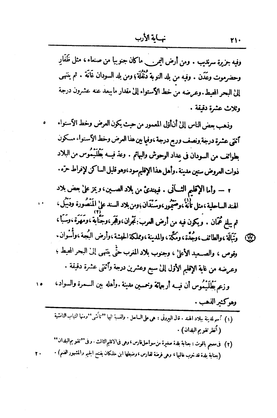 2- وأما الإقليم الثانى. فيبتدئ من بلاد الصين، ويمرّ على بعض بلاد الهند الساحلية، مثل تانة [1] ، وصيمور، وسندان؛ ومن بلاد السند على المنصورة وديبل، ثم يبلغ عمان. ويكون فيه من أرض العرب: نجران، وهجر، وجنّابة [2] ، ومهرة، وسبأ، وتبالة، والطائف، وجدّة، ومكّة، والمدينة، ومملكة الحبشة، وأرض البجة، وأسوان، وقوص، والصعيد الأعلى، وجنوب بلاد المغرب حتّى ينتهى إلى البحر المحيط؛ وعرضه من غاية الإقليم الأوّل إلى سبع وعشرين درجة واثنتى عشرة دقيقة.