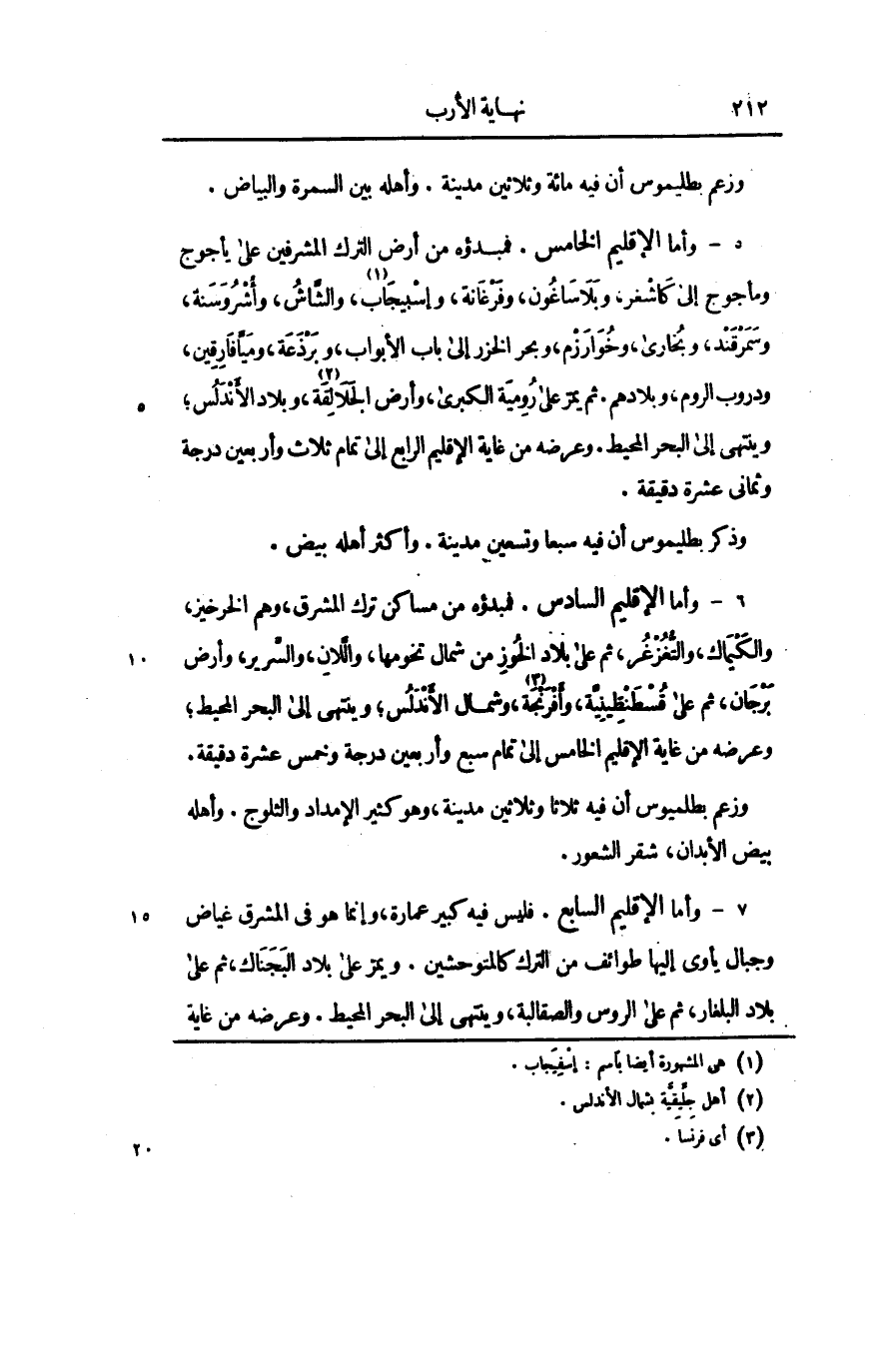 5- وأما الإقليم الخامس. فمبدؤه من أرض الترك المشرفين على يأجوج ومأجوج إلى كاشغر، وبلاساغون، وفرغانة، وإسبيجاب، [1] والشّاش، وأشروسنة، وسمرقند، وبخارى، وخوارزم، وبحر الخزر إلى باب الأبواب، وبرذعة، وميّافارقين، ودروب الروم، وبلادهم. ثم يمرّ على رومية الكبرى، وأرض الجلالقة [2] ، وبلاد الأندلس؛ وينتهى إلى البحر المحيط. وعرضه من غاية الإقليم الرابع إلى تمام ثلاث وأربعين درجة وثمانى عشرة دقيقة.
