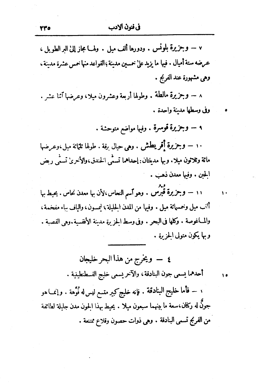 1- فأما خليج البنادقة. فإنه خليج كبير متسع ليس له فوّهة. وإنما هو جون له ركنان، سعة ما بينهما سبعون ميلا. يحيط بهذا الجون مدن جليلة لطائفة من الفرنج تسمى البنادقة. وهى ذوات حصون وقلاع ممتنعة.