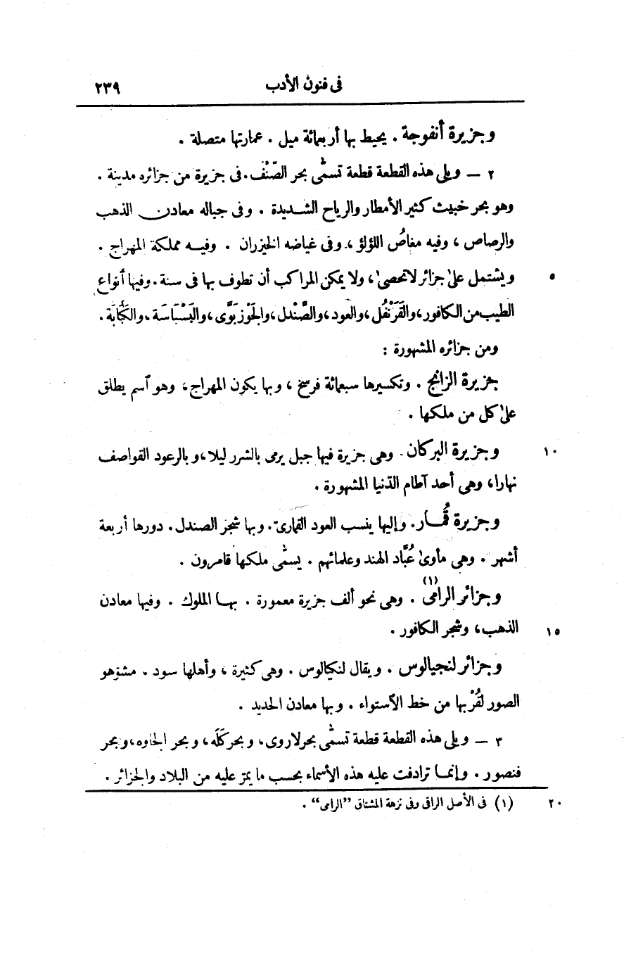 وجزائر الرامى [1] . وهى نحو ألف جزيرة معمورة. بها الملوك. وفيها معادن الذهب، وشجر الكافور.