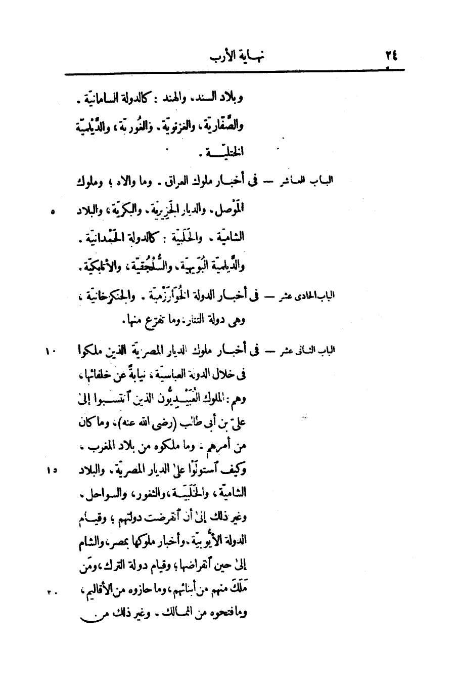 الباب الثانى عشر- فى أخبار ملوك الديار المصريّة الذين ملكوا فى خلال الدولة العباسيّة، نيابة عن خلفائها، وهم: الملوك العبيديّون الذين انتسبوا إلى علىّ بن أبى طالب (رضى الله عنه) ، وما كان من أمرهم، وما ملكوه من بلاد المغرب، وكيف استولوا على الديار المصريّة، والبلاد الشاميّة، والخلبيّة، والثغور، والسواحل، وغير ذلك إنى أن انقرضت دولتهم؛ وقيام الدولة الأيّوبيّة، وأخبار ملوكها بمصر، والشام إلى حين انقراضها؛ وقيام دولة الترك، ومن ملك منهم من أبنائهم، وما حازوه من الأقاليم، وما فتحوه من الممالك، وغير ذلك من