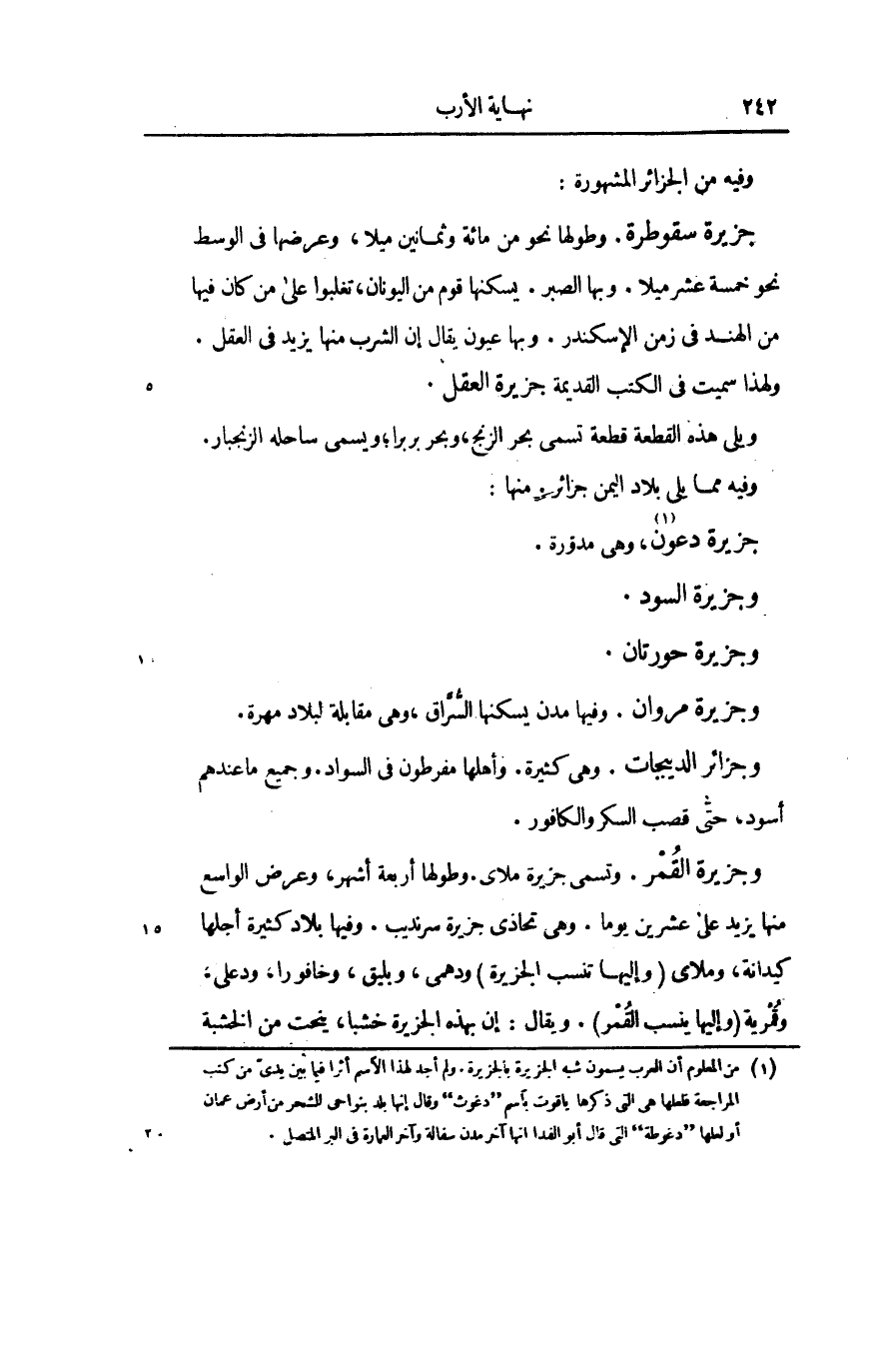 جزيرة سقوطرة. وطولها نحو من مائة وثمانين ميلا، وعرضها فى الوسط نحو خمسة عشر ميلا. وبها الصبر. يسكنها قوم من اليونان، تغلبوا على من كان فيها من الهند فى زمن الإسكندر. وبها عيون يقال إن الشرب منها يزيد فى العقل.