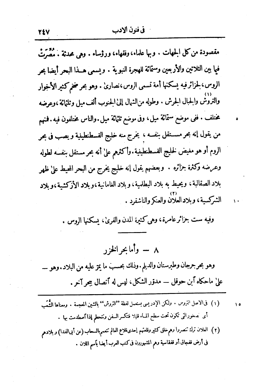 مقصودة من كل الجهات. وبها علماء، وفقهاء، ورؤساء. وهى محدثة. مصّرت فيما بين الثلاثين والأربعين وستمائة للهجرة النبوية. ويسمى هذا البحر أيضا بحر الروس، لجزائر فيه يسكنها أمة تسمى الروس، نصارى. وهو بحر ضخم كثير الأخوار والتّروش [1] والجبال الجرش. وطوله من الشمال إلى الجنوب ألف ميل وثلاثمائة، وعرضه مختلف. ففى موضع ستمائة ميل، وفى موضع ثلاثمائة ميل. والناس مختلفون فيه. فمنهم من يقول إنه بحر مستقل بنفسه، يخرج منه خليج القسطنطينية ويصب فى بحر الروم أو هو مغيض لخليج القسطنطينية. وأكثرهم على أنه بحر مستقل بنفسه لطوله وعرضه وكثرة جزائره. وبعضهم يقول إنه خليج يخرج من البحر المحيط على ظهر بلاد الصقالبة، ويحيط به بلاد البطلمية، وبلاد الغامانية، وبلاد الأزكشية، وبلاد الشركسية، وبلاد العلان [2] والعنكر والناشقرد.