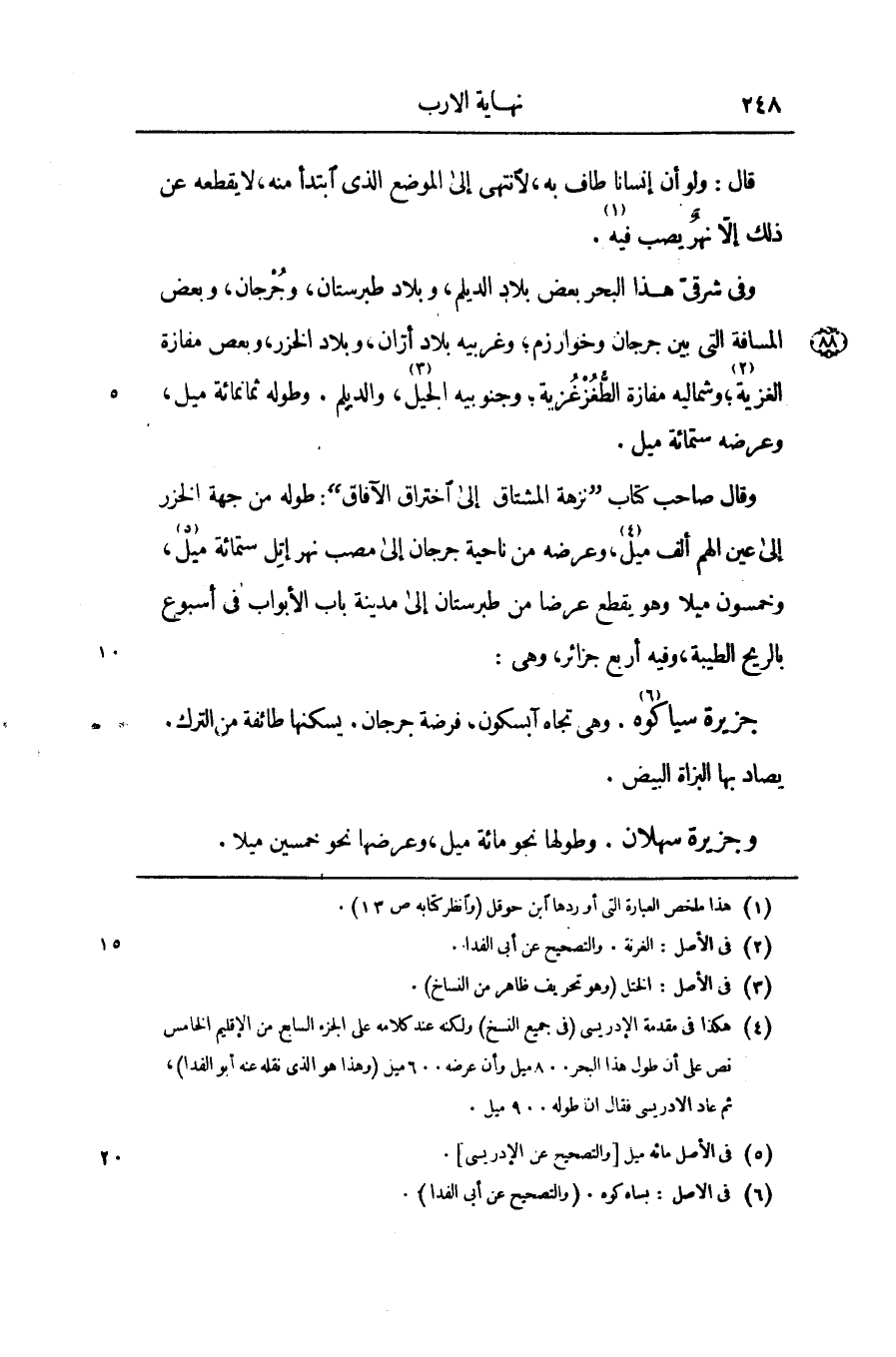 [4] هكذا فى مقدمة الإدريسى (فى جميع النسخ) ولكنه عند كلامه على الجزء السابع من الإقليم الخامس نص على أن طول هذا البحر 800 ميل وأن عرضه 600 ميل (وهذا هو الذى نقله عنه أبو الفدا) ، ثم عاد الادريسى فقال ان طوله 900 ميل.