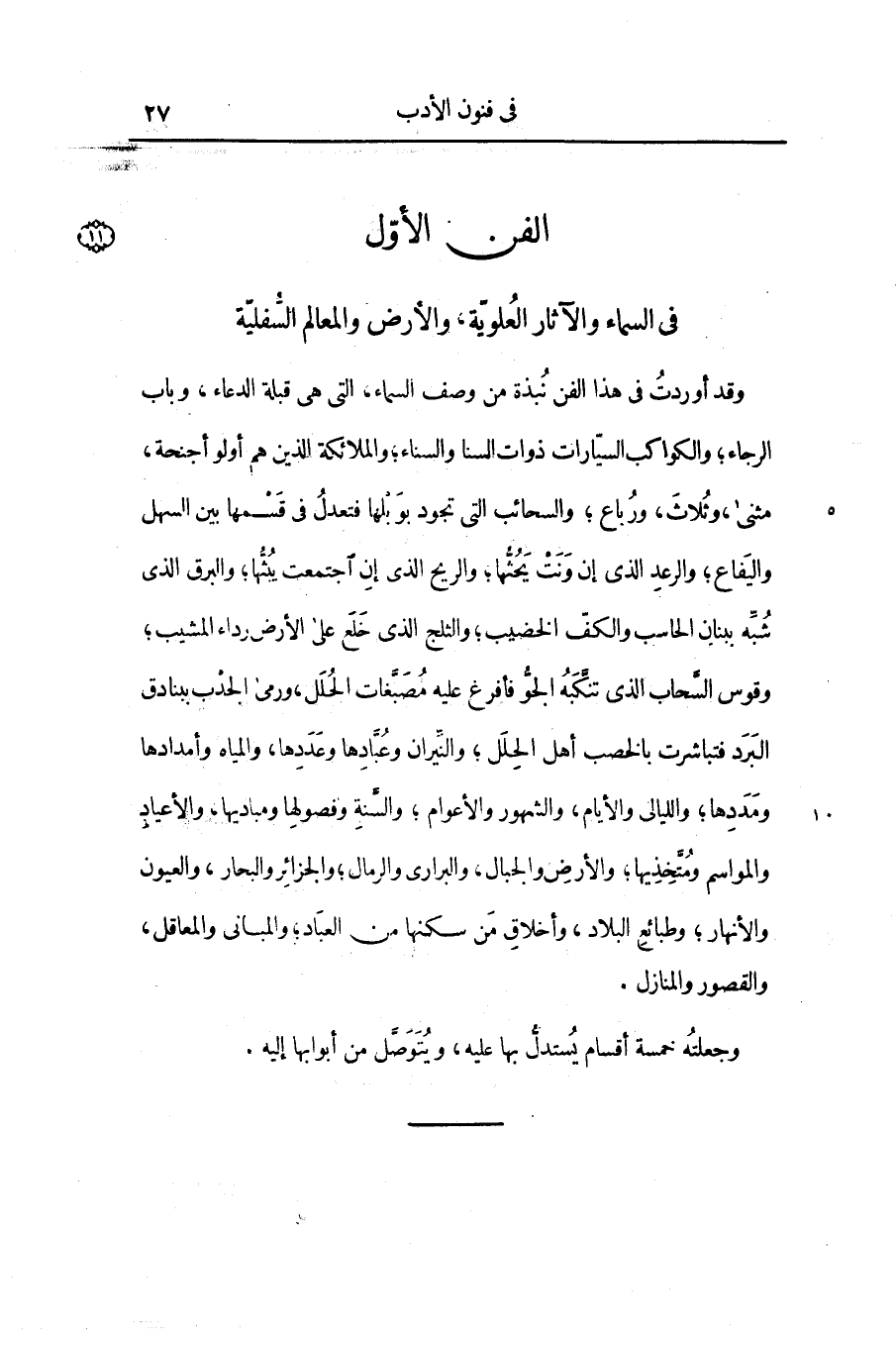 وقد أوردت فى هذا الفن نبذة من وصف السماء، التى هى قبلة الدعاء، وباب الرجاء؛ والكواكب السيّارات ذوات السنا والسناء؛ والملائكة الذين هم أولو أجنحة، مثنى، وثلاث، ورباع؛ والسحائب التى تجود بوبلها فتعدل فى قسمها بين السهل واليفاع؛ والرعد الذى إن ونت يحثّها؛ والريح الذى إن اجتمعت يبثّها؛ والبرق الذى شبّه ببنان الحاسب والكفّ الخضيب؛ والثلج الذى خلع على الأرض رداء المشيب؛ وقوس السّحاب الذى تنكّبه الجوّ فأفرغ عليه مصبّغات الحلل، ورمى الجدب ببنادق البرد فتباشرت بالخصب أهل الحلل؛ والنّيران وعبّادها وعددها، والمياه وأمدادها ومددها؛ والليالى والأيام، والشهور والأعوام؛ والسّنة وفصولها ومباديها، والأعياد والمواسم ومتّخذيها؛ والأرض والجبال، والبرارى والرمال؛ والجزائر والبحار، والعيون والأنهار؛ وطبائع البلاد، وأخلاق من سكنها من العباد؛ والمبانى والمعاقل، والقصور والمنازل.