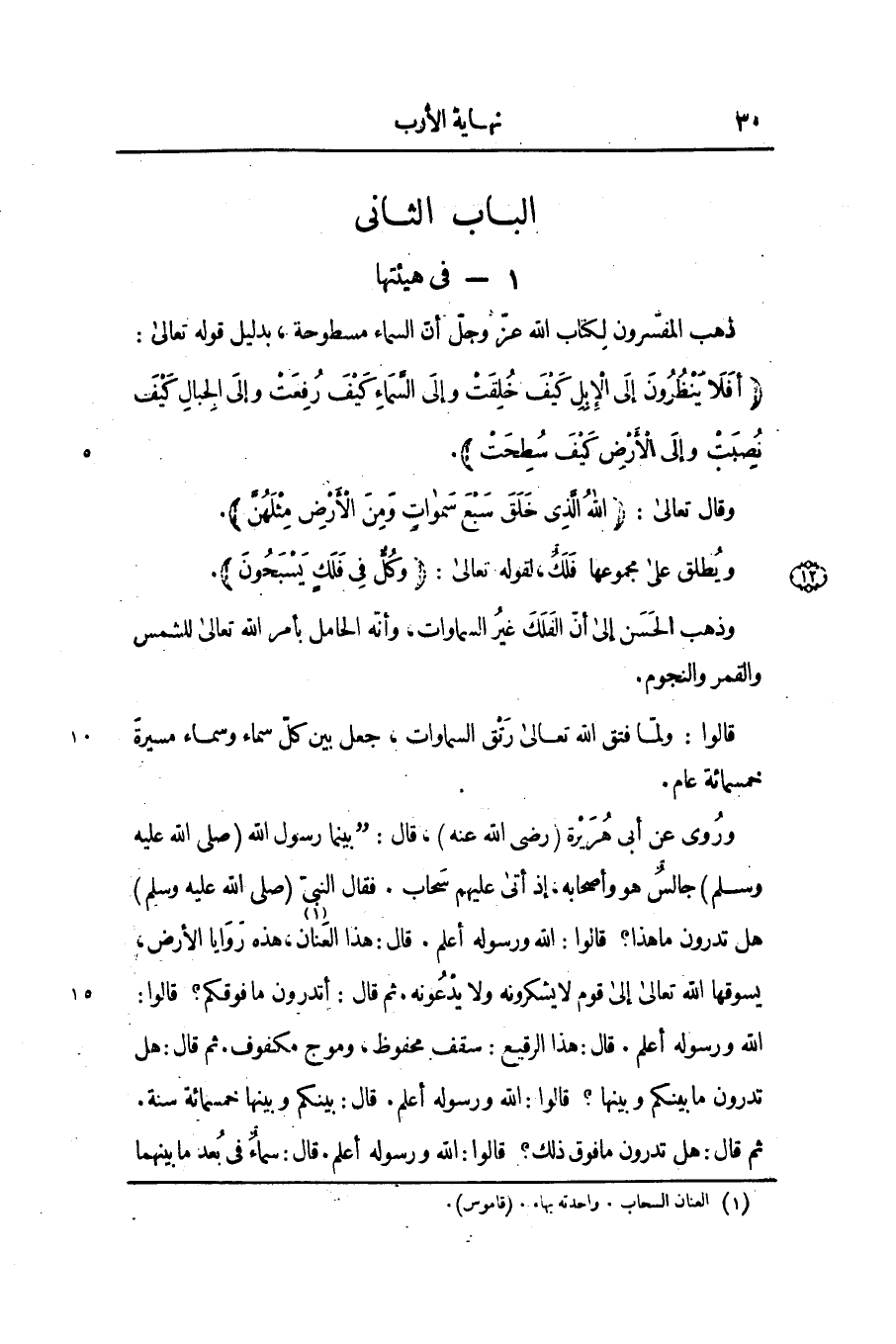 وروى عن أبى هريرة (رضى الله عنه) ، قال: «بينما رسول الله (صلى الله عليه وسلم) جالس هو وأصحابه، إذ أتى عليهم سحاب. فقال النبىّ (صلى الله عليه وسلم) هل تدرون ما هذا؟ قالوا: الله ورسوله أعلم. قال: هذا العنان [1] ، هذه روايا الأرض، يسوقها الله تعالى إلى قوم لا يشكرونه ولا يدعونه. ثم قال: أتدرون ما فوقكم؟ قالوا: