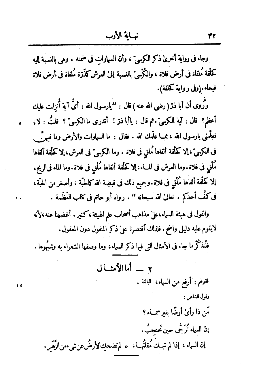 وروى أن أبا ذرّ (رضى الله عنه) قال: «يا رسول الله: أىّ آية أنزلت عليك أعظم؟ قال: آية الكرسىّ. ثم قال: يا أبا ذرّ! أتدرى ما الكرسىّ؟ قلت: لا؛ فعلّمنى يا رسول الله، مما علّمك الله. فقال: ما السماوات والأرض وما فيهنّ فى الكرسىّ، إلا كحلقة ألقاها ملق فى فلاة. وما الكرسىّ فى العرش، إلا كحلقة ألقاها ملق فى فلاة. وما العرش فى الماء، إلا كحلقة ألقاها ملق فى فلاة. وما الماء فى الريح، إلا كحلقة ألقاها ملق فى فلاة. وجميع ذلك فى قبضة الله كالحبّة، وأصغر من الحبّة، فى كفّ أحدكم. تعالى الله سبحانه»