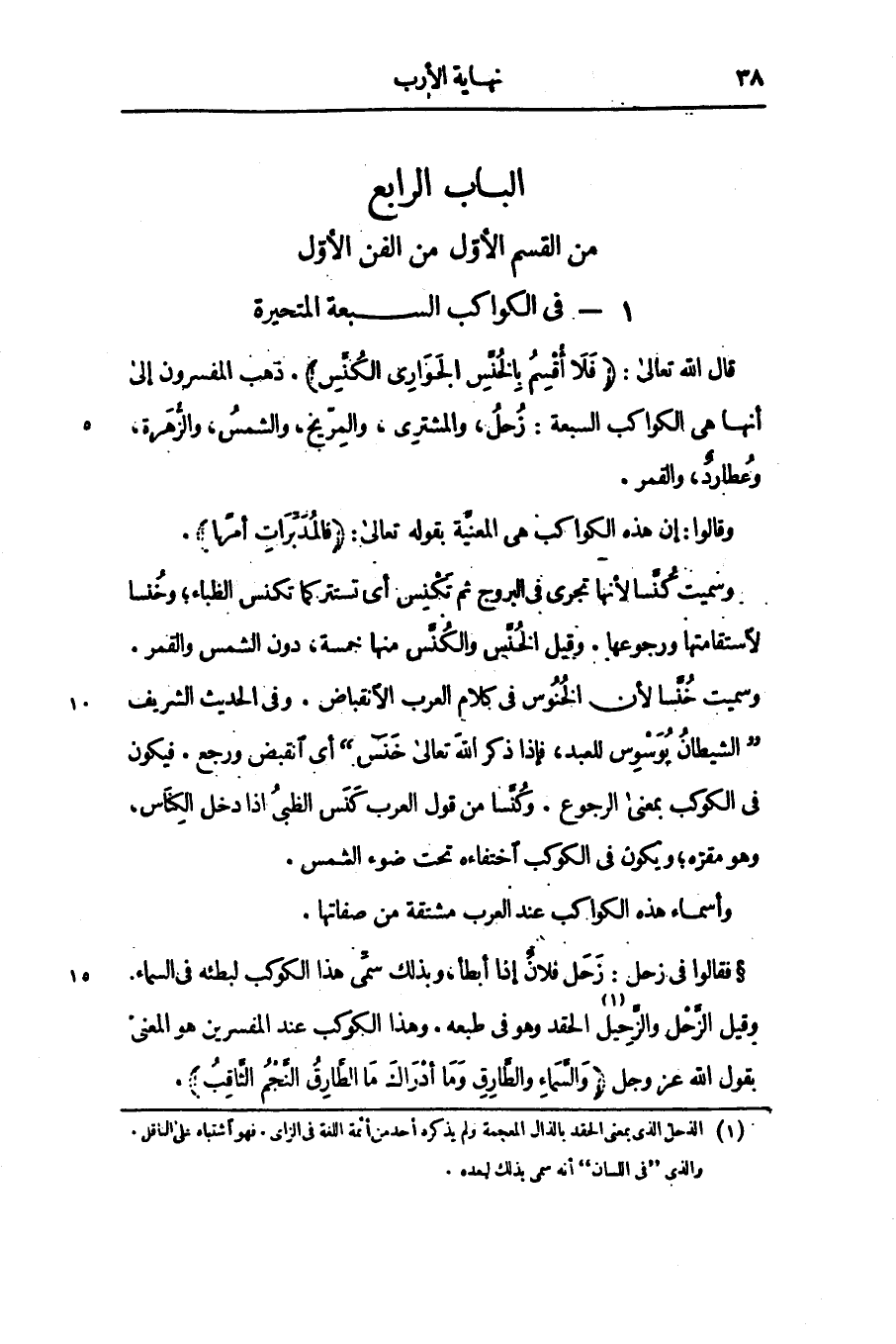 وسميت كنّسا لأنها تجرى فى البروج ثم تكنس أى تستتر كما تكنس الظباء؛ وخنسا لاستقامتها ورجوعها. وقيل الخنّس والكنّس منها خمسة، دون الشمس والقمر.