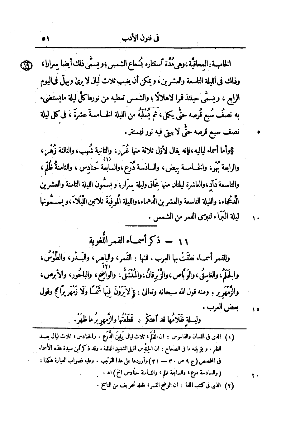 وأما أسماء لياليه، فإنه يقال لأوّل ثلاثة منها غرر، والثانية شهب، والثالثة زهر، والرابعة بهر، والخامسة بيض، والسادسة درع، والسابعة [1] حنادس، والثامنة ظلم، والتاسعة داد، والعاشرة ليلتان منها محاق وليلة سرار؛ ويسمّون الليلة الثامنة والعشرين الدّعجاء، والليلة التاسعة والعشرين الدّهماء، والليلة الموفية ثلاثين اللّيلاء، ويسمّونها ليلة البراء لتبرّى القمر من الشمس.