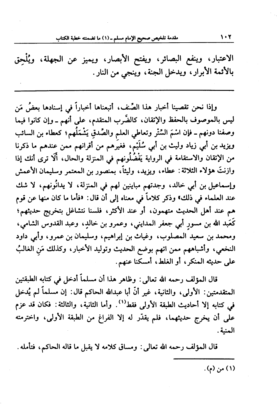 قال المؤلف رحمه الله تعالى: وظاهرُ هذا أن مسلمًا أدخَلَ في كتابه الطبقتين المتقدِّمتين: الأولى والثانية، غير أنَّ أبا عبد الله الحاكم قال: إنَّ مسلمًا لم يُدخِل في كتابه إلا أحاديث الطبقة الأولى فقط (¬1)، وأما الثانية والثالثة: فكان قد عزَمَ على أن يخرِّج حديثهما، فلم يُقَدَّر له إلا الفراغُ من الطبقة الأولى، واخترمته المنية.