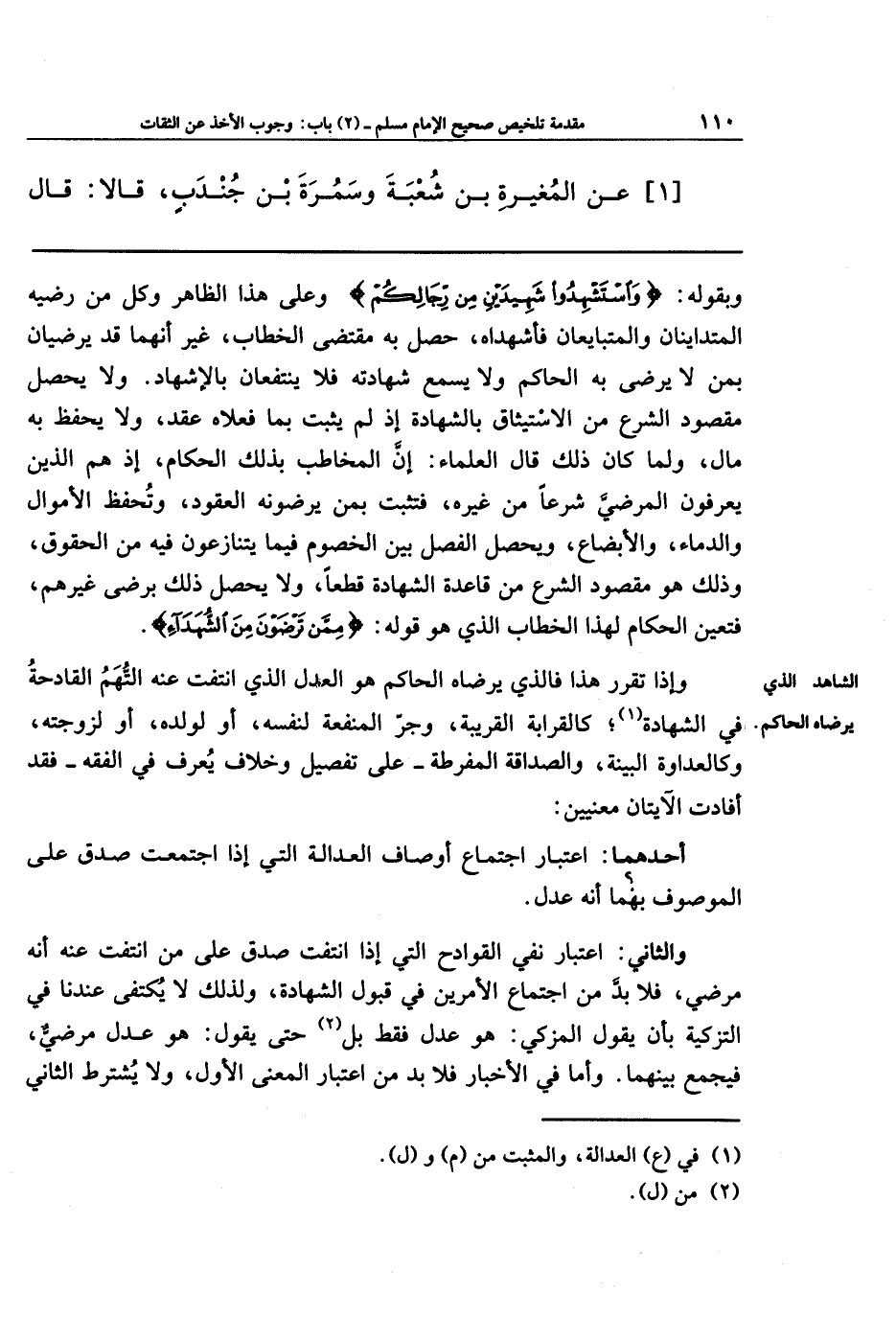 وبقوله: {وَاستَشهِدُوا شَهِيدَينِ مِن رِجَالِكُم} وعلى هذا الظاهر وكُلُّ مَن رضيه المتداينان والمتبايعان فأشهداه، حصَلَ به مقتضى الخطاب؛ غير أنَّهُمَا قد يرضيان بِمَن لا يرضى به الحاكم، ولا يسمَعُ شهادته، فلا ينتفعان بالإشهاد، ولا يحصُلُ مقصودُ الشرع من الاستيثاقِ بالشهادة؛ إذ لم يثبُت بما فعلاه عَقدٌ، ولا يُحفَظُ به مال.