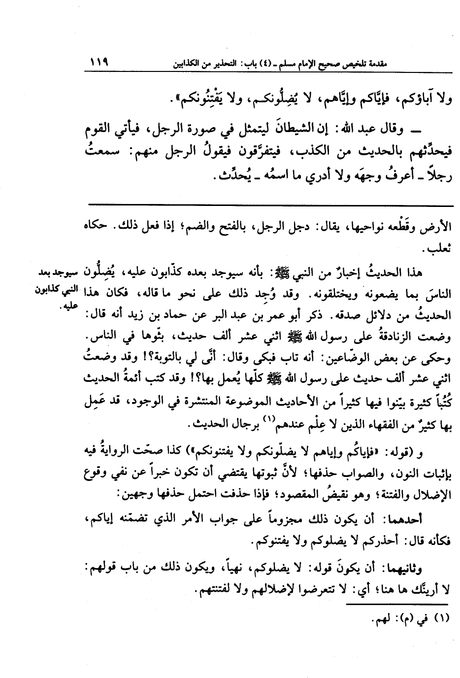و(قوله: فَإِيَّاكُم وَإِيَّاهُم! لا يُضِلُّونَكُم، وَلاَ يَفتِنُونَكُم) كذا صحَّتِ الروايةُ فيه بإثبات النون، والصوابُ حذفها؛ لأنَّ ثبوتها يقتضي أن تكون خبرًا عن نَفي وقوعِ الإضلالِ والفتنة، وهو نقيضُ المقصود، فإذا حُذِفَت، احتَمَل حذفُهَا وجهين: