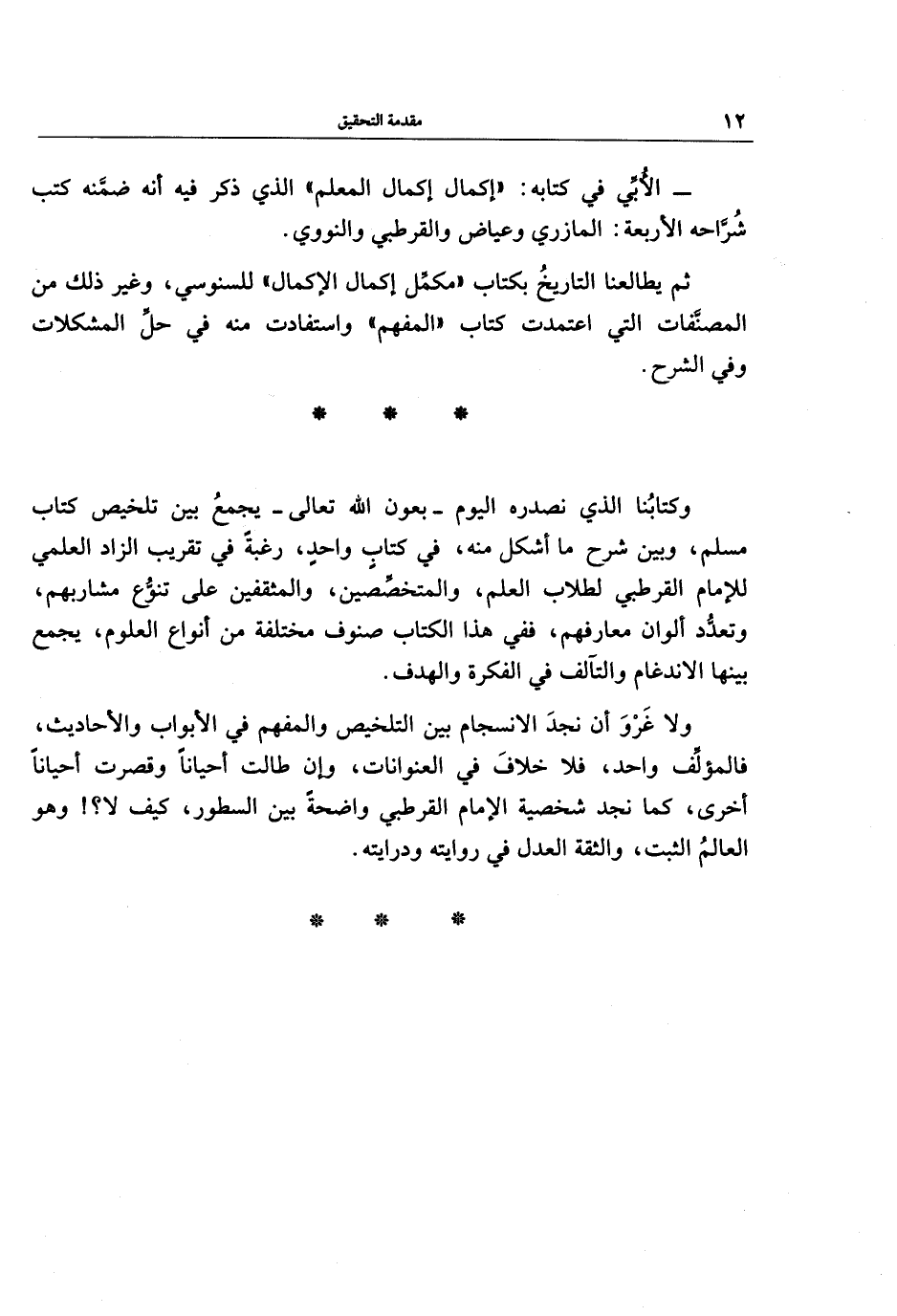 وكتابُنا الذي نصدره اليوم - بعون الله تعالى - يجمعُ بين تلخيص كتاب مسلم، وبين شرح ما أشكل منه، في كتابٍ واحدٍ، رغبةً في تقريب الزاد العلمي للإمام القرطبي لطلاب العلم، والمتخصِّصين، والمثقفين على تنوُّع مشاربهم، وتعدُّد ألوان معارفهم، ففي هذا الكتاب صنوف مختلفة من أنواع العلوم، يجمع بينها الاندغام والتآلف في الفكرة والهدف.