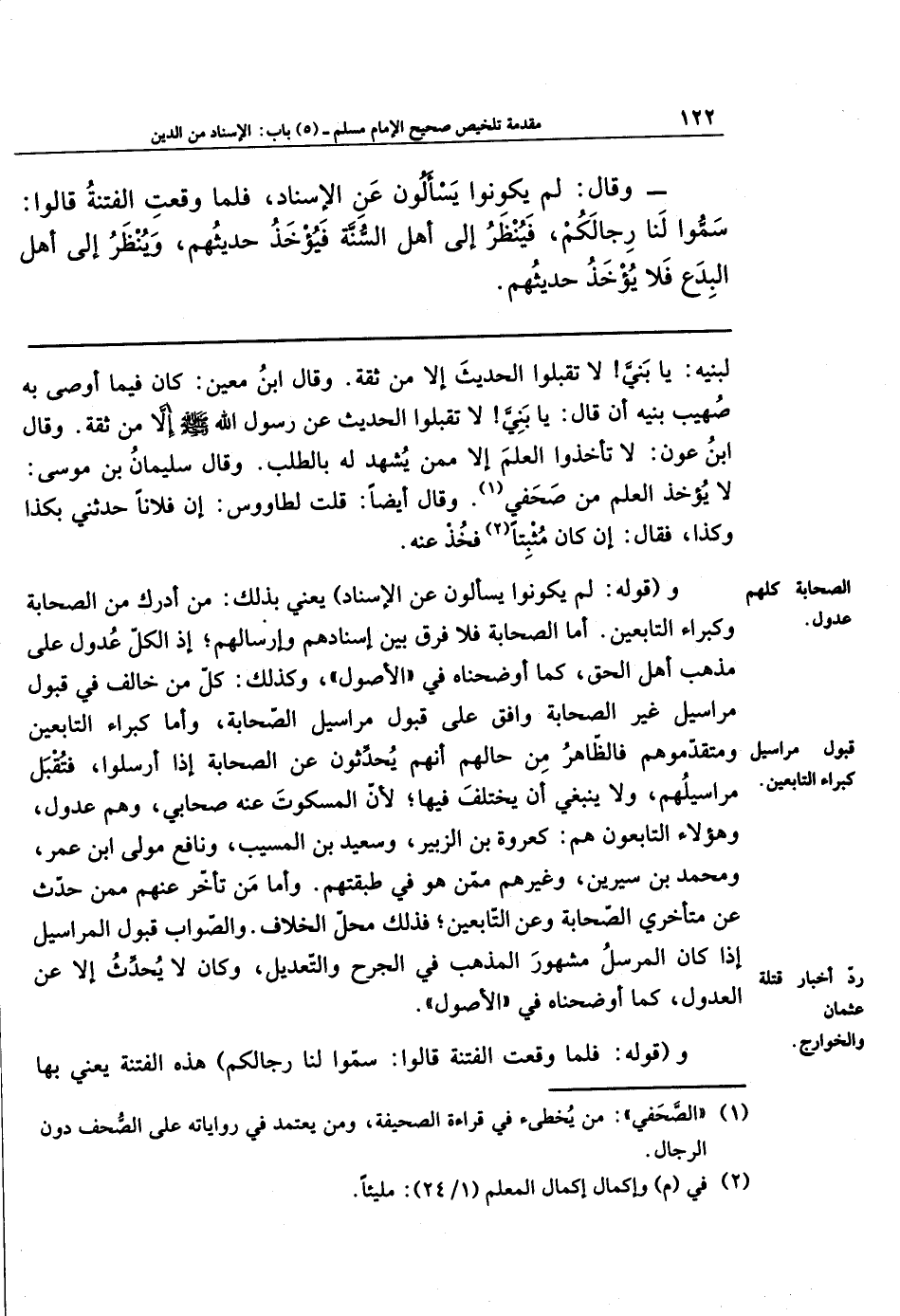 - وَقَالَ: لَم يَكُونُوا يَسأَلُونَ عَنِ الإِسنَادِ، فَلمَّا وَقَعَتِ الفِتنَةُ قَالُوا: سَمُّوا لَناَ رِجَاَلكُم: فَيُنظَرُ إِلى أَهلِ السُّنَّةِ فَيُؤخَذُ حَدِيثُهُم، وَيُنُظَرُ إِلَى أَهلِ البِدَعِ فَلاَ يُؤخَذُ حَدِيثُهُم.