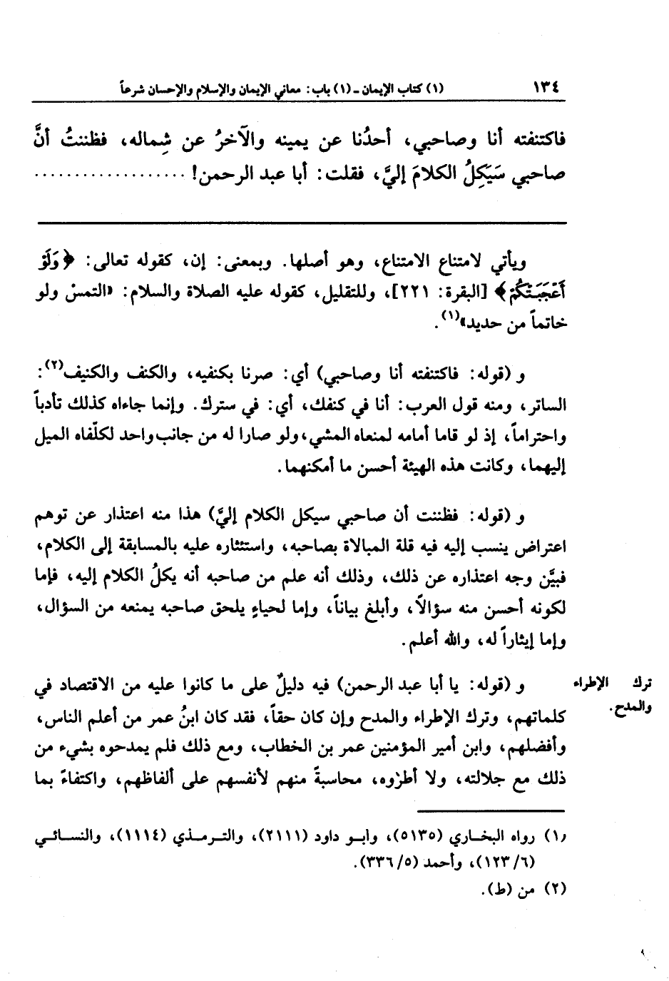 و(قوله: يا أبا عبدِ الرحمن: فيه دليلٌ على ما كانوا عليه من الاقتصاد في كلماتهم، وتركِ الإطراء والمدح وإن كان حقًّا، فقد كان ابنُ عمر مِن أعلمِ الناس وأفضلهم، وابنَ أميرِ المؤمنين عمر بن الخَطَّاب، ومع ذلك فلم يمدحوه بشيء مِن ذلك مع جلالتِهِ ولا أَطرَوهُ؛ محاسبةً منهم لأنفسهم على ألفاظهم، واكتِفاءً بما