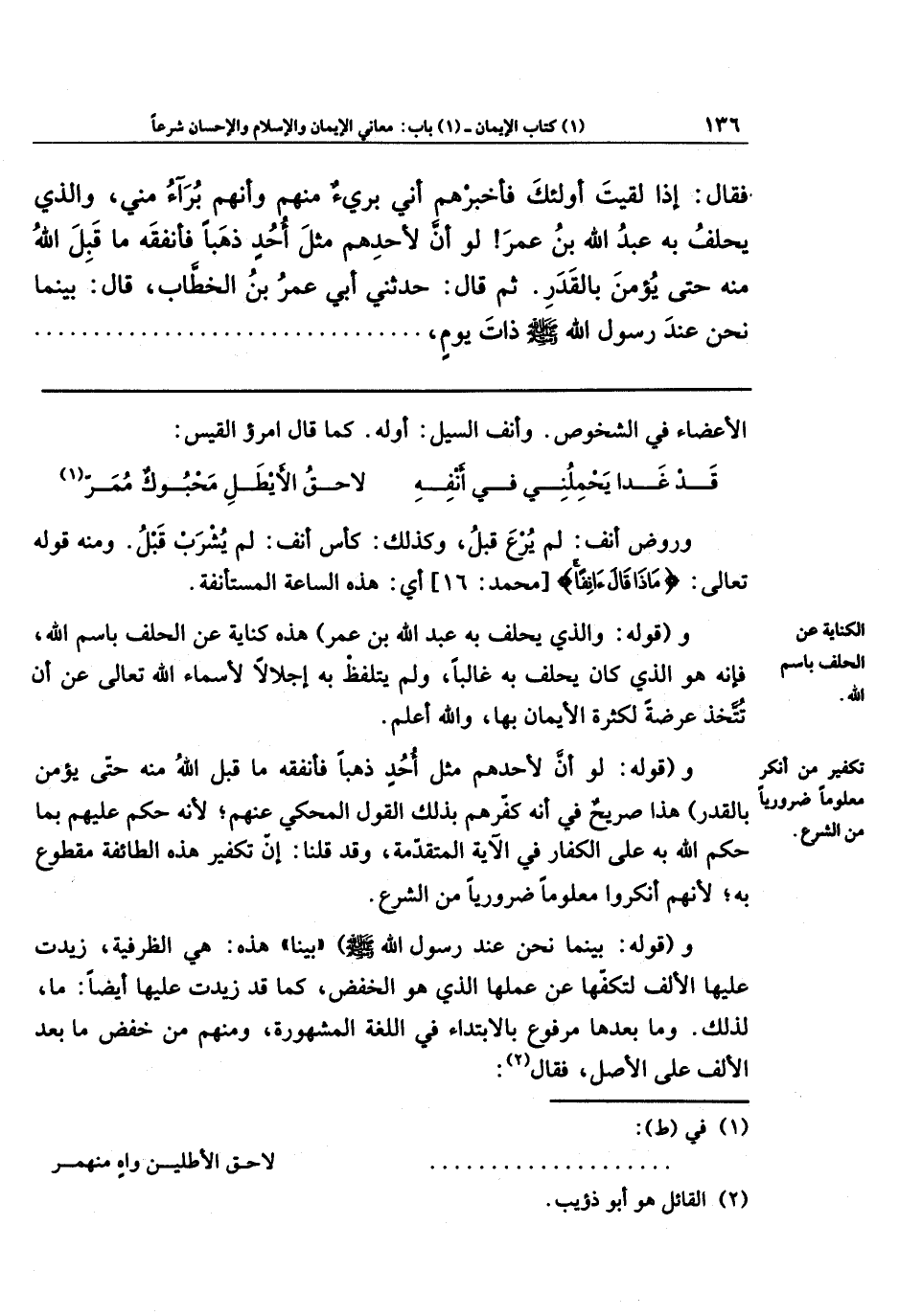 فقَالَ: إِذَا لَقِيتَ أُولَئِكَ فَأَخبِرهُم أَنِّي بَرِيءٌ مِنهُم، وَأَنَّهُم بُرَآءُ مِنِّي، وَالَّذِي يَحلِفُ بِهِ عَبدُ اللهِ بنُ عُمَرَ! لَو أَنَّ لِأَحَدِهِم مِثلَ أُحُدٍ ذَهَبًا فَأَنفَقَهُ، مَا قَبِلَ اللهُ مِنهُ حَتَّى يُؤمِنَ بِالقَدَرِ. ثُمَّ قَالَ: حَدَّثَنِي أَبِي عُمَرُ بنُ الخَطَّابِ، قَالَ: بَينَما نَحنُ عِندَ رَسُولِ الله - صلى الله عليه وسلم - ذَاتَ يَومٍ،