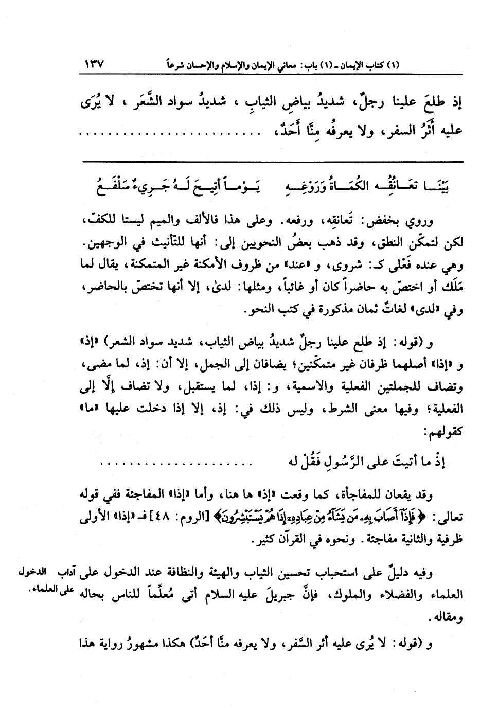 و(قوله: إِذ طَلَعَ عَلَينَا رَجُلٌ شَدِيدُ بَيَاضِ الثِّيَابِ، شَدِيدُ سَوَادِ الشَّعرِ): إذ وإذا أصلهما ظرفان غير متمكِّنَينِ، يضافان إلى الجمل، إلاَّ أنَّ إذ: لما مضى، وتضاف للجملتَينِ الفعليَّةِ والاسميَّة. وإذا: لما يُستَقبَلُ، ولا تُضافُ إلاَّ إلى الفعليَّة، وفيها معنى الشرط، وليس ذلك في إذ، إلاّ إذا دخلَت عليها ما؛ كقولهم: