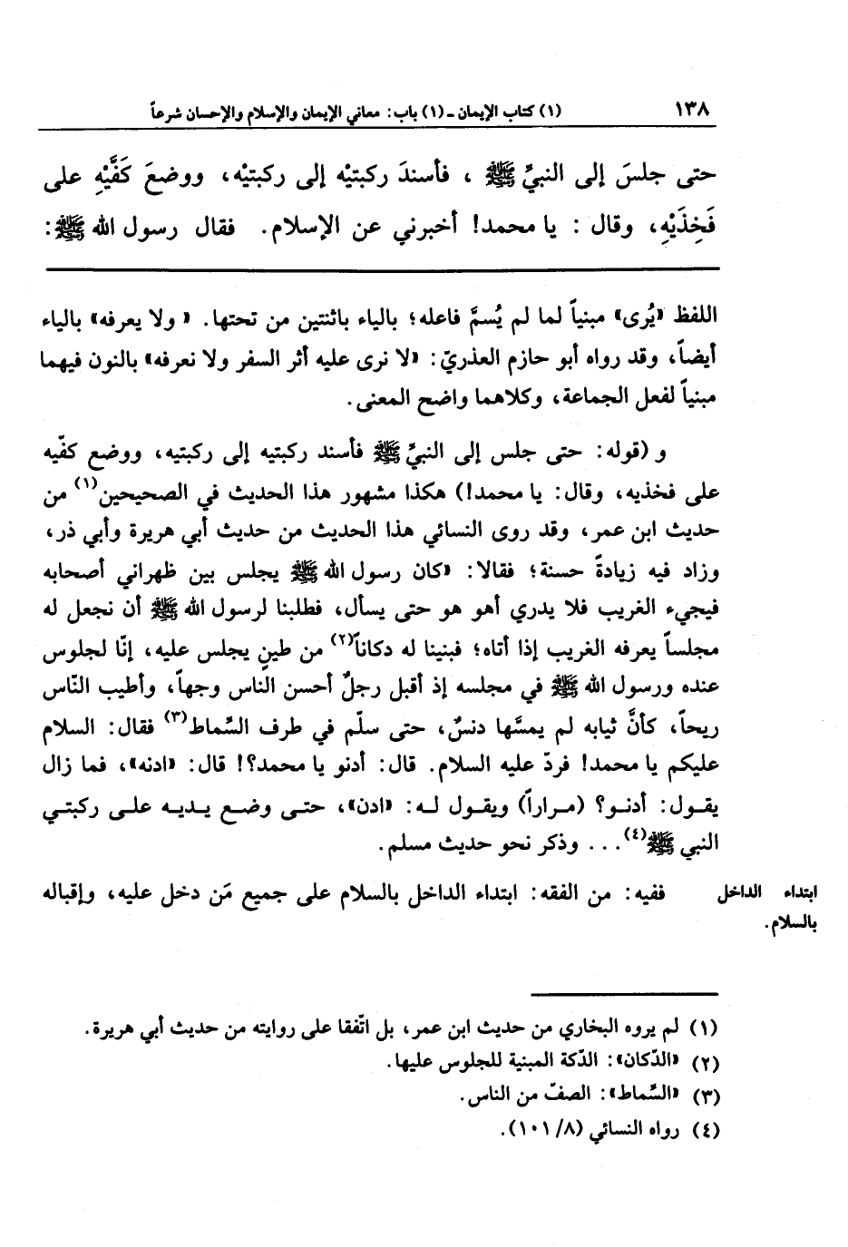 حَتَّى جَلَسَ إِلَى النَّبِيِّ - صلى الله عليه وسلم - فَأَسنَدَ رُكبَتَيهِ إِلَى رُكبَتَيهِ، وَوَضَعَ كَفَّيهِ عَلَى فَخِذَيهِ، وَقَالَ: يَا مُحَمَّدُ، أَخبِرنِي عَنِ الإِسلامِ. فَقَالَ رَسُولُ الله - صلى الله عليه وسلم -: