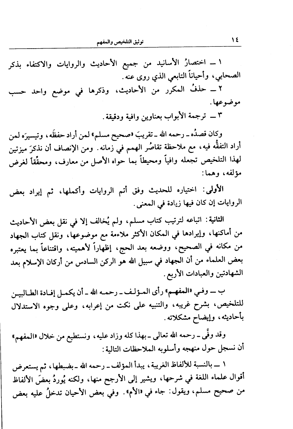 ب - وفي "المفهم" رأى المؤلف - رحمه الله - أن يكمل إفادة الطالبين للتلخيص، بشرح غريبه، والتنبيه على نكت من إعرابه، وعلى وجوه الاستدلال بأحاديثه، وايضاح مشكلاته.