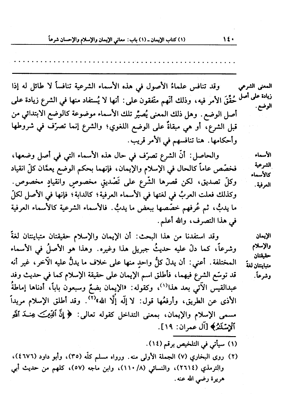 والحاصل: أنَّ الشرعَ تصرَّف في حال هذه الأسماء التي في أصلِ وضعها، فخصّص عامًّا، كالحال في الإسلام والإيمان؛ فإنّهما بحكم الوضع يَعُمَّانِ كلَّ انقياد، وكلَّ تصديق، لكن قَصَرَها الشرعُ على تصديقٍ مخصوص وانقيادٍ مخصوص؛ وكذلك فعلَتِ العربُ في لغتها في الأسماء العُرفيَّة، كالدابَّةِ: فإنَّها في الأصل لكلِّ ما يَدِبُّ، ثمَّ عُرفُهُم خصَّصها ببعض ما يَدِبُّ؛ فالأسماءُ الشرعيَّةُ كالأسماء العرفيَّة في هذا التصرُّف، والله أعلم.