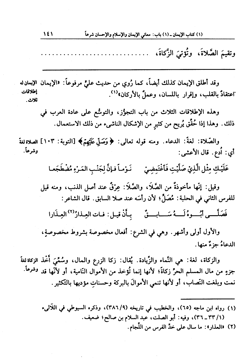 وقد أطلَقَ الإيمانَ كذلك أيضًا؛ كما رُوِيَ من حديثِ عليٍّ مرفوعًا: الإيمَانُ اعتِقَادٌ بِالقَلبِ، وإقرارٌ باللِّسَان، وعَمَلٌ بالأَركَان (¬1).