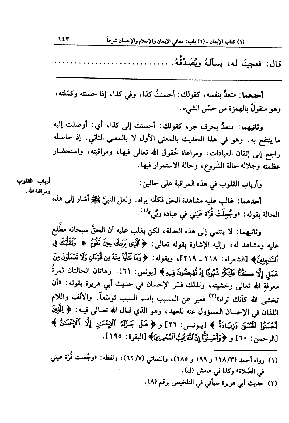 وهاتان الحالتان ثمرةُ معرفةِ الله تعالى وخشيتِهِ؛ ولذلك فسَّر الإحسانَ في حديث أبي هريرة بقوله: أَن تخشى اللهَ كأَنَّك تراه (¬2)؛ فعبَّرَ عن المسبَّب باسم السَّبَب توسُّعًا، والألفُ واللامُ اللذان في الإحسان المسؤول عنه للعهد، وهو الذي قال الله تعالى فيه: لِلَّذِينَ أَحسَنُوا الحُسنَى وَزِيَادَةٌ، و: هَل جَزَاءُ الإِحسَانِ إِلَّا الإِحسَانُ، و: وَأَحسِنُوا إِنَّ اللَّهَ يُحِبُّ المُحسِنِينَ.