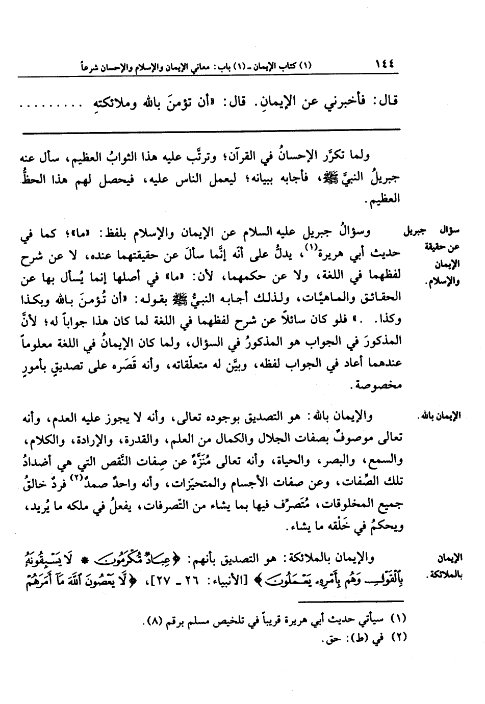 وسؤالُ جبريل عليه السلام عن الإيمانِ والإسلام بلفظ: ما كما في حديث أبي هريرة (¬1)، يدُلُّ على أنَّهُ إنما سأل عن حقيقتهما عنده، لا عن شَرحِ لفظهما في اللغة، ولا عن حُكمِهما؛ لأنّ ما في أصلها إنما يُسأَلُ بها عن الحقائق والماهيات. ولذلك أجابه النبيُّ - صلى الله عليه وسلم - بقوله: أن تُؤمِنَ بالله وبكذا وكذا؛ فلو كان سائلاً عن شرح لفظهما في اللغة لَمَا كان هذا جوابًا له؛ لأنَّ المذكورَ في الجواب هو المذكورُ في السؤال، ولمّا كان الإيمانُ في اللغة معلومًا عندهما، أعاد في الجوابِ لفظَهُ، وبيَّنَ له متعلَّقاتِهِ، وأنَّهُ قصره على تصديقٍ بأمورٍ مخصوصة.