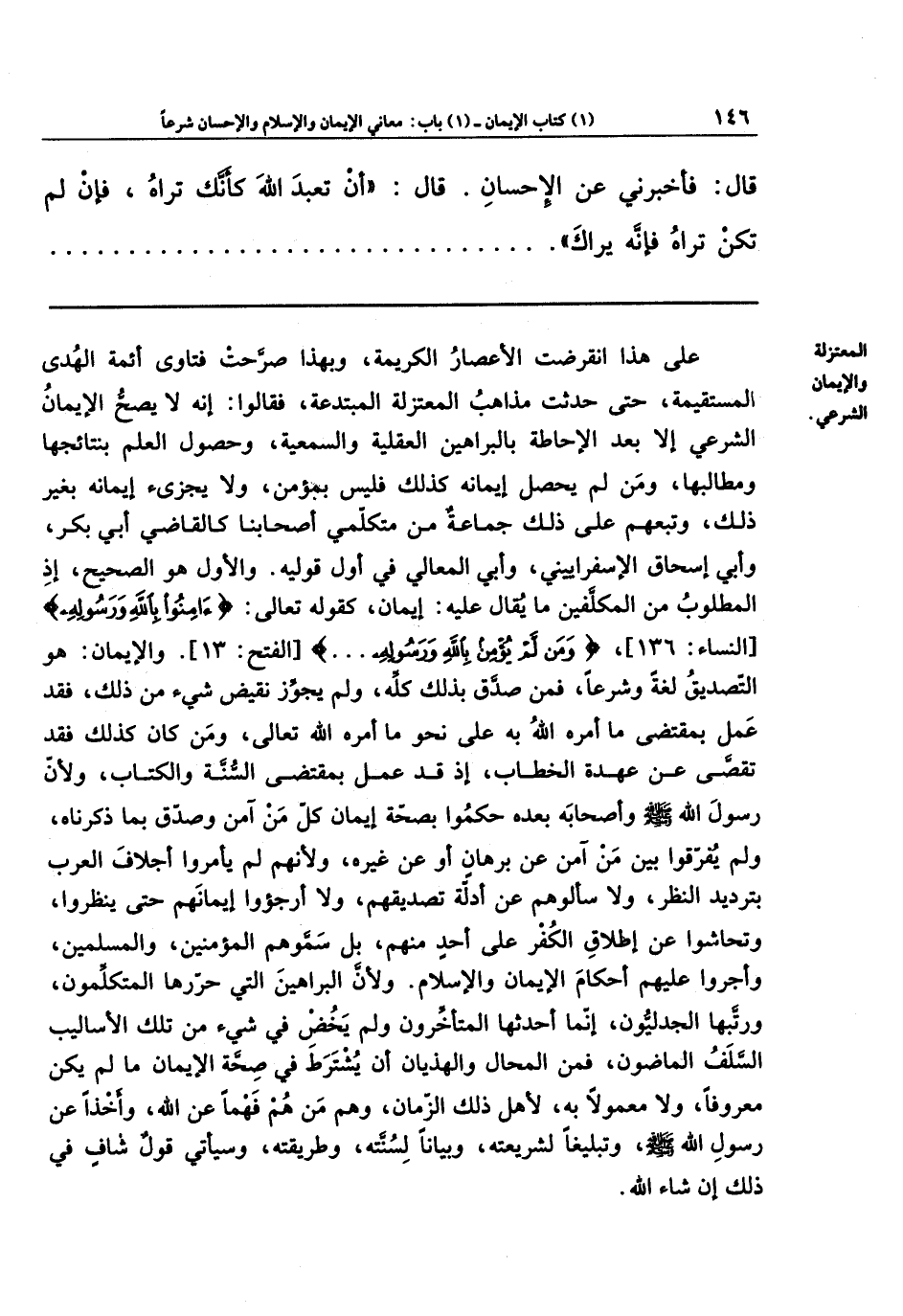 على هذا انقرضَتِ الأعصارُ الكريمة، وبها صرَّحت فتاوى أئمة الهدى المستقيمة، حتى حدثَت مذاهبُ المعتزلة المبتدعة، فقالوا: إنَّهُ لا يصحُّ الإيمانُ الشرعيُّ إلا بعد الإحاطةِ بالبراهينِ العقليَّةِ والسمعيَّة، وحصولِ العلمِ بنتائجها ومطالبها، ومَن لم يحصُل إيمانه كذلك فليس بمؤمن، ولا يجزئ إيمانُهُ بغير ذلك؛ وتبعهم على ذلك جماعةٌ من متكلِّمي أصحابنا؛ كالقاضي أبي بكر، وأبي إسحاقَ الإسفَرَايِينِيِّ، وأبي المَعَالِي في أوَّل قولَيهِ.