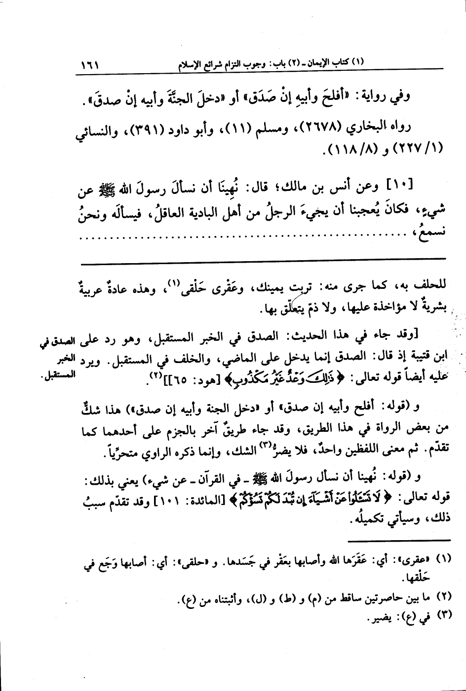 [10] وَعَن أَنَسِ بنِ مَالِك، قَالَ: نُهِينَا أَن نَسأَلَ رسولَ الله - صلى الله عليه وسلم - عَن شَيءٍ، فَكَانَ يُعجِبُنَا أَن يَجِيءَ الرَّجُلُ مِن أهل البَادِيَةِ العَاقِلُ، فَيَسأَلَهُ وَنَحنُ نَسمَعُ،