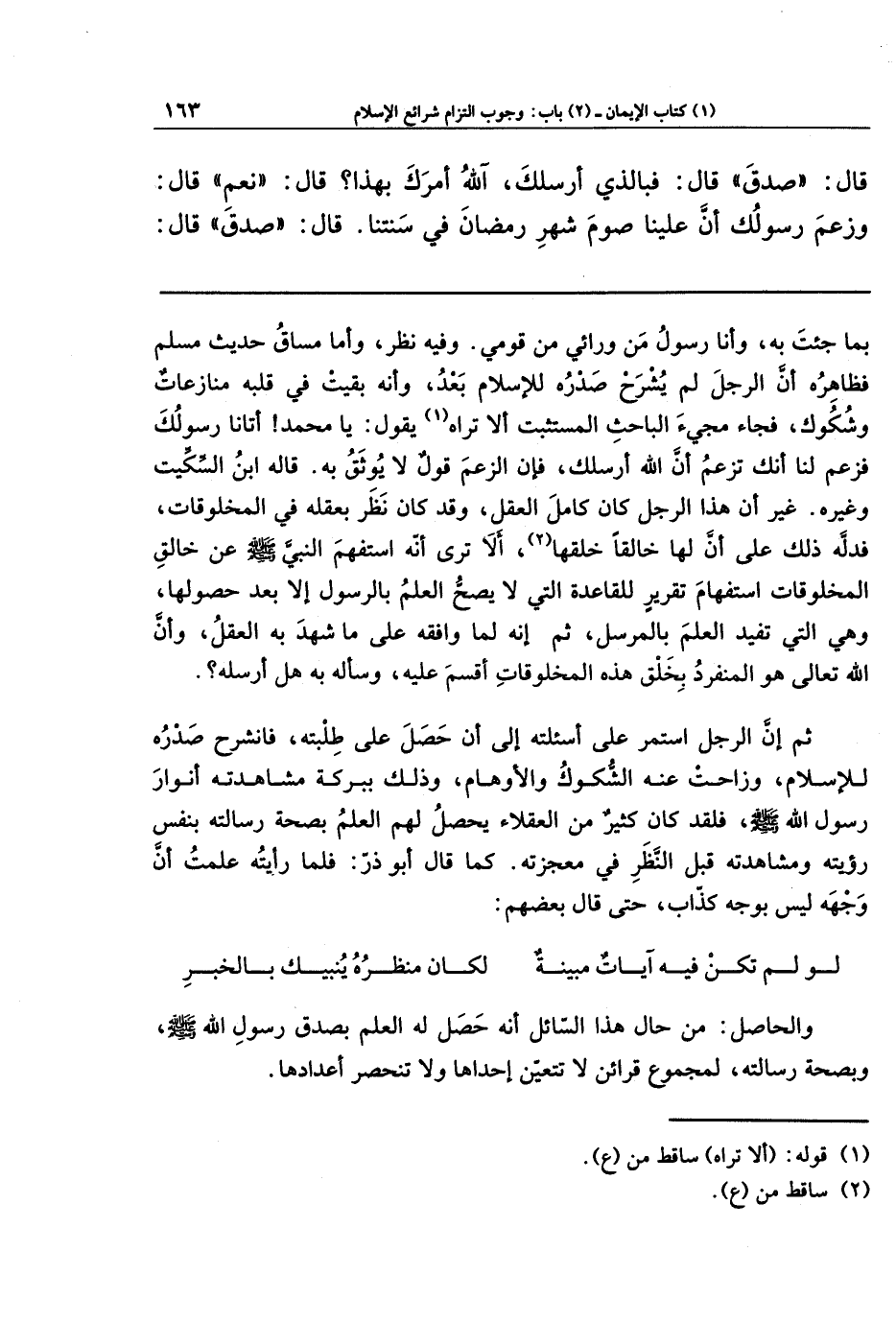 والحاصلُ: مِن حال هذا السائل أنَّهُ حصَلَ له العلمُ بصدقِ رسولِ الله - صلى الله عليه وسلم -، وبصحَّةِ رسالتِهِ لمجموع قرائن لا تتعيَّنُ إحداها ولا تنحصرُ أعدادها.