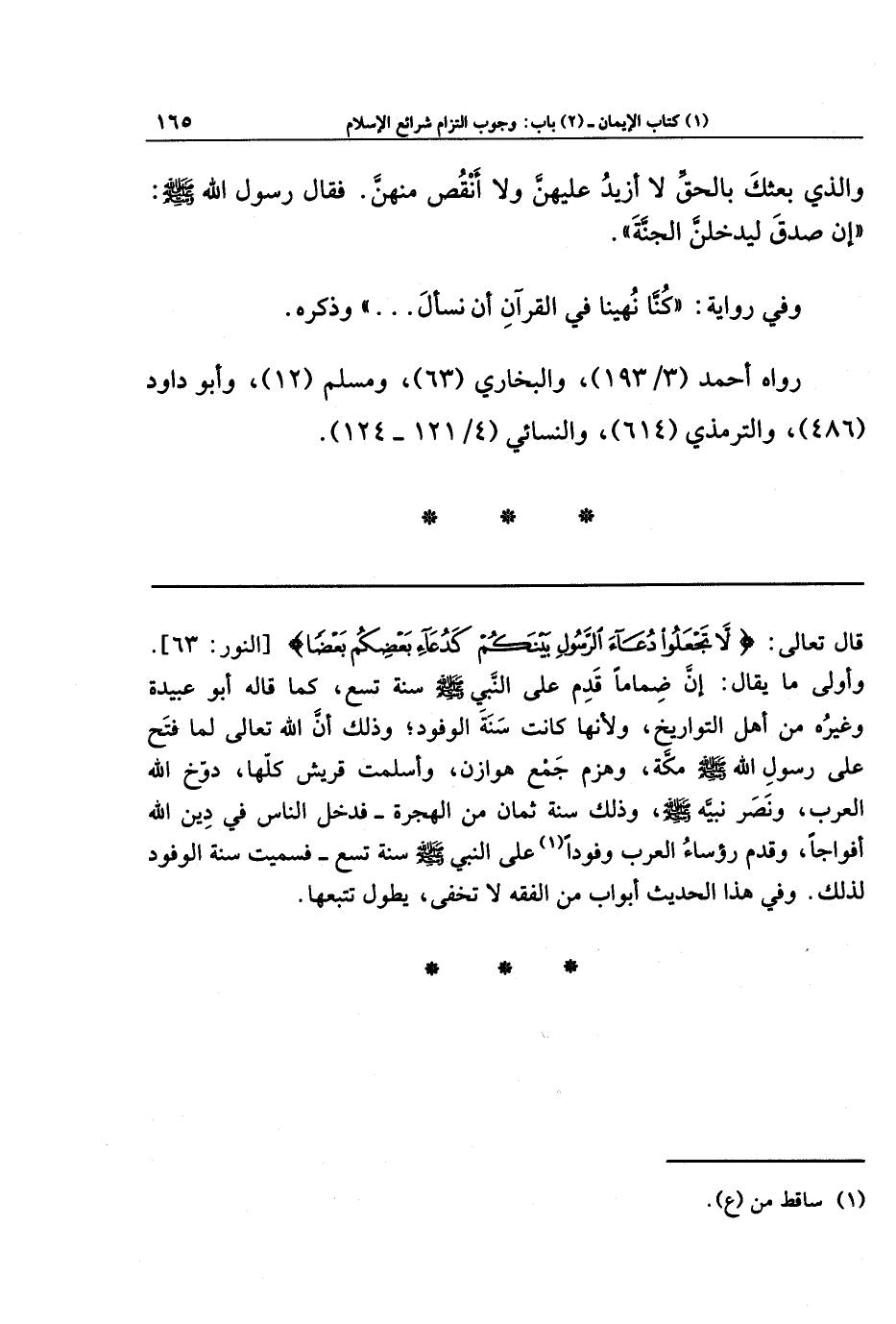 قال تعالى: لَا تَجعَلُوا دُعَاءَ الرَّسُولِ بَينَكُم كَدُعَاءِ بَعضِكُم بَعضًا، وأَولَى ما يقال: إنّ ضِمَامًا قَدِمَ على النبي - صلى الله عليه وسلم - سنة تِسعٍ؛ كما قاله أبو عُبَيدَةَ وغيرُهُ من أهل التواريخ، ولأنَّها كانت سنةَ الوفود؛ وذلك أنَّ الله تعالى لمَّا فتَحَ على رسول الله - صلى الله عليه وسلم - مَكَّةَ، وهزَمَ جَمعَ هَوَازِنَ، وأسلَمت قريشٌ كلُّها -: دوَّخَ اللهُ العرَبَ، ونصَرَ نبيَّه - صلى الله عليه وسلم -، وذلك سنةَ ثمانٍ من الهجرة؛ فدخَلَ الناسُ في دين الله أفواجًا، وقَدِمَ رؤساءُ العربِ وفودا (¬1) على النبيِّ - صلى الله عليه وسلم - سنة تسع، فَسُمِّيَت: سنةَ الوفود لذلك. وفي هذا الحديث أبوابٌ من الفقه لا تخفَى يطولُ تتبُّعُهَا.