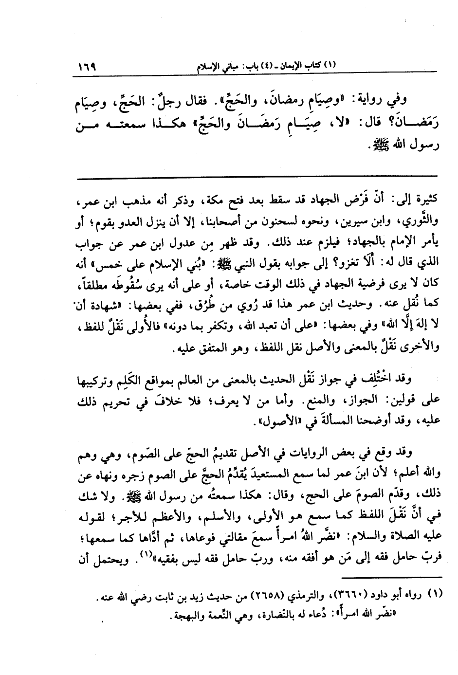 وقد وقع في بعضِ الرواياتِ في الأصل تقديمُ الحجِّ على الصوم، وهي وَهَمٌ، والله أعلم؛ لأنَّ ابن عمر لمَّا سَمِعَ المستعيدَ يُقدِّمُ الحجَّ على الصوم، زجَرَهُ ونهاه عن ذلك، وقدَّم الصومَ على الحجِّ، وقال: هكَذَا سَمِعتُهُ مِن رَسُولِ الله - صلى الله عليه وسلم -. ولا شك في أنَّ نقل اللفظ كما سُمِعَ هو الأَولَى والأسلم، والأعظم للأجر؛ لقوله - عليه الصلاة والسلام -: نَضَّرَ اللهُ امرَأً سَمِعَ مَقَالَتِي فَوَعَاهَا، ثُمَّ أَدَّاهَا كَمَا سَمِعَهَا؛ فَرُبَّ حَامِلِ فِقهٍ إِلَى مَن هو أَفقَهُ مِنهُ، وَرُبَّ حَامِلِ فِقهٍ لَيسَ بِفَقِيهٍ (¬1). ويَحتَمِلُ أن