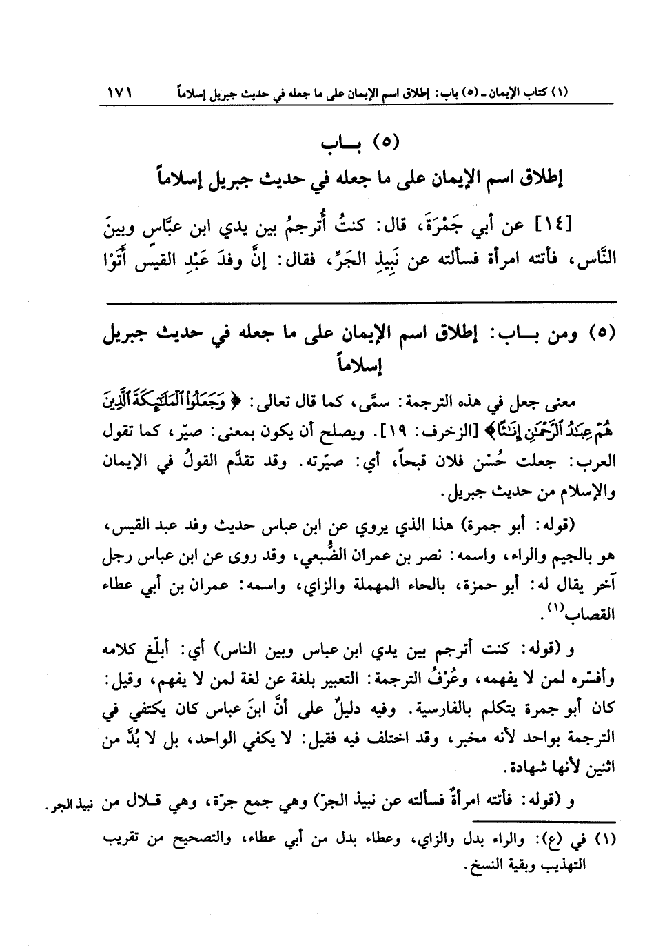 (5) وَمِن بَابُ إِطلاَقِ اسمِ الإِيمَانِ عَلَى مَا جَعَلَهُ فِي حَدِيثِ جِبرِيلَ إِسلاَمًا