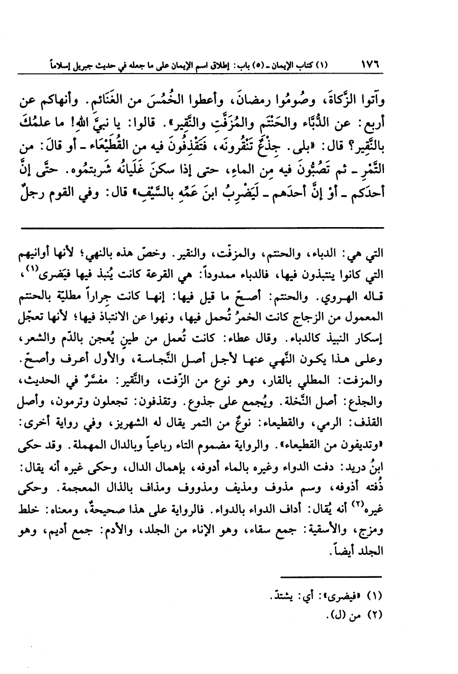 وَآتُوا الزَّكَاةَ، وَصُومُوا رَمَضَانَ، وَأَعطُوا الخُمُسَ مِنَ الغَنَائِمِ، وَأَنهَاكُم عَن أَربَعٍ: عَنِ الدُّبَّاءِ، وَالحَنتَمِ، وَالمُزَفَّتِ، وَالنَّقِيرِ، قَالُوا: يَا نَبِيَّ اللهِ، مَا عِلمُكَ بِالنَّقِيرِ؟ قَالَ: بَلَى؛ جِذعٌ تَنقُرُونَهُ، فَتَقذِفُونَ فِيهِ مِنَ القُطَيعَاءِ - أو قَالَ: مِنَ التَّمرِ - ثُمَّ تَصُبُّونَ فِيهِ مِنَ المَاءِ، حَتَّى إِذَا سَكَنَ غَلَيَانُهُ شَرِبتُمُوهُ، حَتَّى إِنَّ أَحَدَكُم - أو إِنَّ أَحَدَهُم - لَيَضرِبُ ابنَ عَمِّهِ بِالسَّيفِ، قَال: وَفِي القَومِ رَجُلٌ