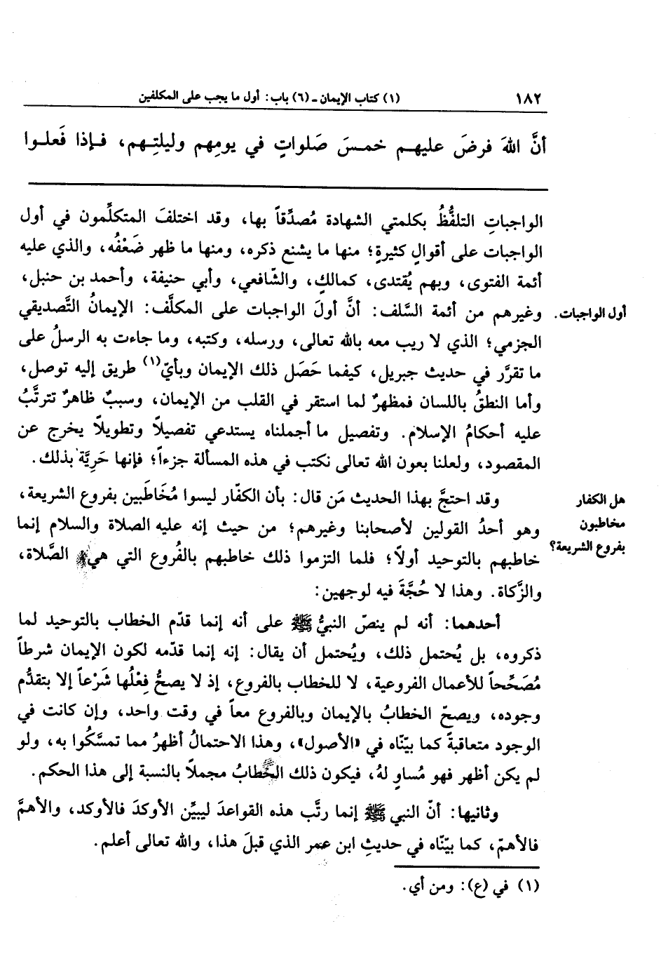 وقد اختلف المتكلِّمون في أوَّل الواجبات على أقوالٍ كثيرةٍ، منها ما يَشنُعُ ذكره، ومنها ما ظَهَرَ ضعفه، والذي عليه أئمَّةُ الفتوى، وبهم يُقتَدَى كمالكٍ، والشافعيِّ، وأبي حنيفةَ، وأحمدَ بن حنبل، وغيرِهِم من أئمَّةِ السلف: أنَّ أوَّلَ الواجباتِ على المكلَّف: الإيمانُ التصديقيُّ الجَزمِيُّ الذي لا رَيبَ معه بالله تعالى ورسلِهِ وكُتُبِه، وما جاءت به الرسلُ، على ما تقرَّرَ في حديثِ جبريلَ، كيفما حصَلَ ذلك الإيمان، وبأيِّ (¬1) طريقٍ إليه تُوُصِّلَ، وأما النطقُ باللسان: فمُظهِرٌ لما استَقَرَّ في القلب من الإيمان، وسَبَبٌ ظاهرٌ تترتَّبُ عليه أحكامُ الإسلام. وتفصيلُ ما أجملناه يستدعي تفصيلاً وتطويلاً يُخرِجُ عن المقصود، ولعلَّنَا بِعَونِ الله تعالى نكتُبُ في هذه المسألة جزءًا؛ فإنها حَرِيَّةٌ بذلك.