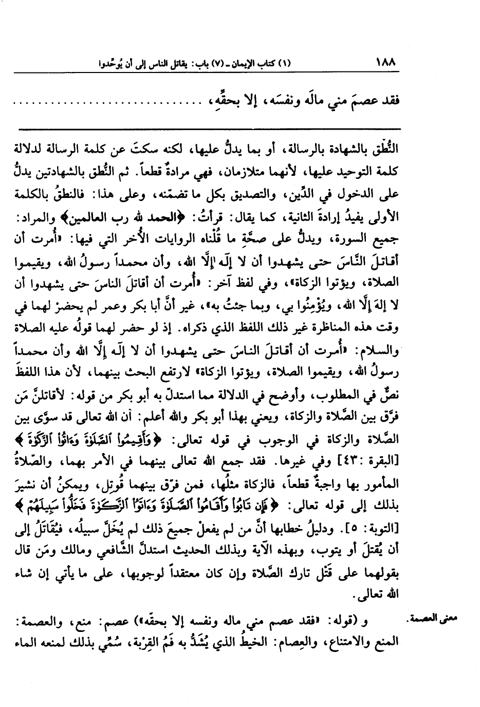 ثُمَّ النطقُ بالشهادتَين يدلُّ على الدخولِ في الدِّينِ والتصديقِ بكلِّ ما تضمَّنه؛ وعلى هذا: فالنطقُ بالكلمةِ الأولى يفيدُ إرادةَ الثانية، كما يقال: قرأتُ: الحَمدُ لِلَّهِ رَبِّ العَالَمِينَ والمرادُ جميعُ السورة. ويدلُّ على صِحَّةِ ما قلناه: الرواياتُ الأُخَرُ التي فيها: أُمِرتُ أَن أُقَاتِلَ النَّاسَ حَتَّى يَشهَدُوا أَن لا إِلهَ إِلا اللهُ، وَأَنَّ مُحَمَّدًا رَسُولُ الله، وَيُقِيمُوا الصَّلاَةَ، وَيُؤتُوا الزَّكَاةَ، وفي لفظٍ آخر: أُمِرتُ أَن أُقَاتِلَ النَّاسَ حَتَّى يَشهَدُوا أَن لا إِلهَ إِلا اللهُ، وَيُؤمِنُوا بِي، وَبِمَا جِئتُ بِهِ. غير أنَّ أبا بكر وعمر لم يَحضر لهما في وقتِ هذه المناظرة غيرُ ذلك اللفظِ الذي ذكراه؛ إذ لو حضر لهما قولُهُ - عليه الصلاة والسلام -: أُمِرتُ أَن أُقَاتِلَ النَّاسَ حَتَّى يَشهَدُوا أَن لا إِلهَ إِلا اللهُ، وَأَنَّ مُحَمَّدًا رَسُولُ الله، وَيُقِيمُوا الصَّلاَةَ وَيُؤتُوا الزَّكَاةَ، لارتفَعَ البحثُ بينهما؛ لأنَّ هذا اللفظَ نَصُّ في المطلوب، وأوضَحُ في الدلالة ممَّا استدَلَّ به أبو بكر مِن قوله: لَأُقَاتِلَنَّ مَن فَرَّقَ بَينَ الصَّلاَةِ وَالزَّكَاةِ.
