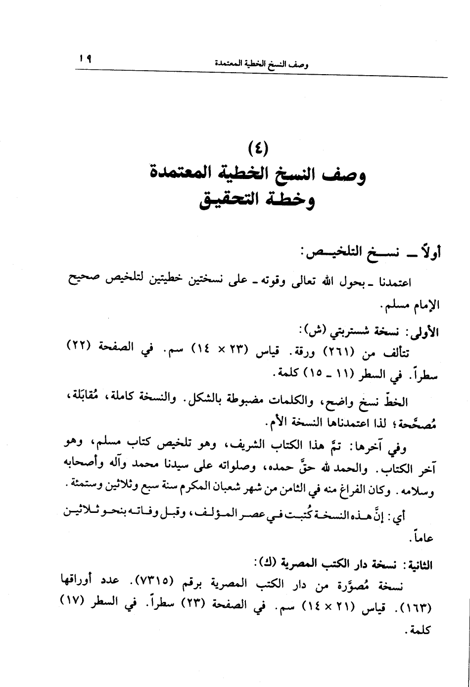 اعتمدنا - بحول الله تعالى وقوته - على نسختين خطيتين لتلخيص صحيح الإمام مسلم.